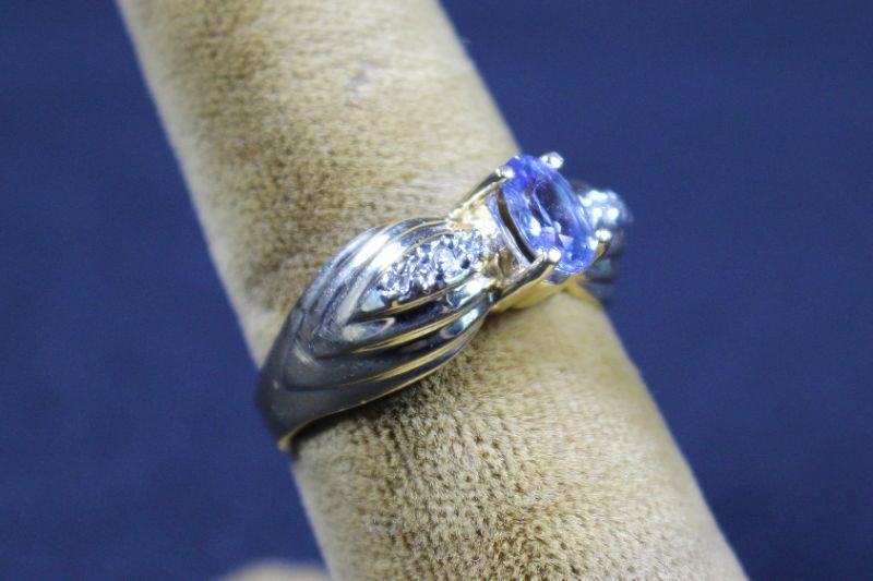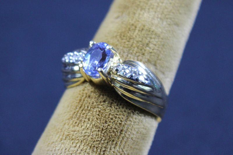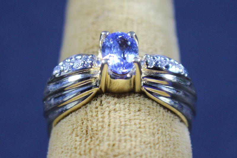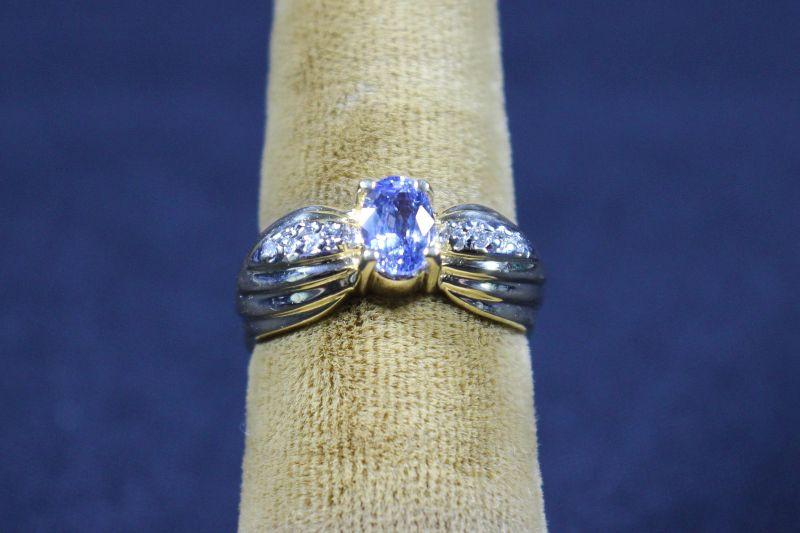 Bluish-purple oval stone flanked by eight clear colored brilliant cut stones.