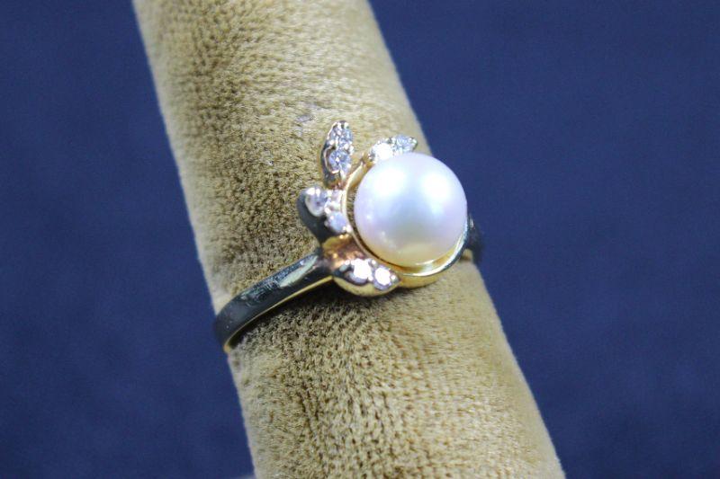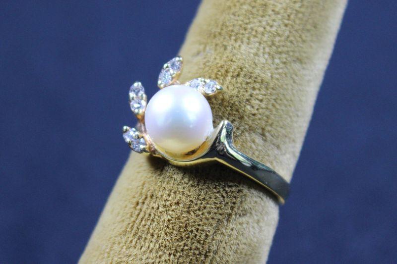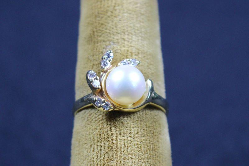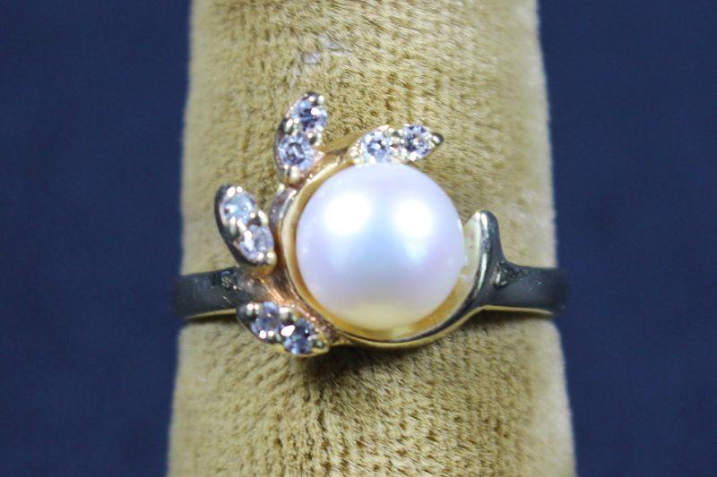 Pearl colored solitaire with eight brilliant cut stones surrounding.
