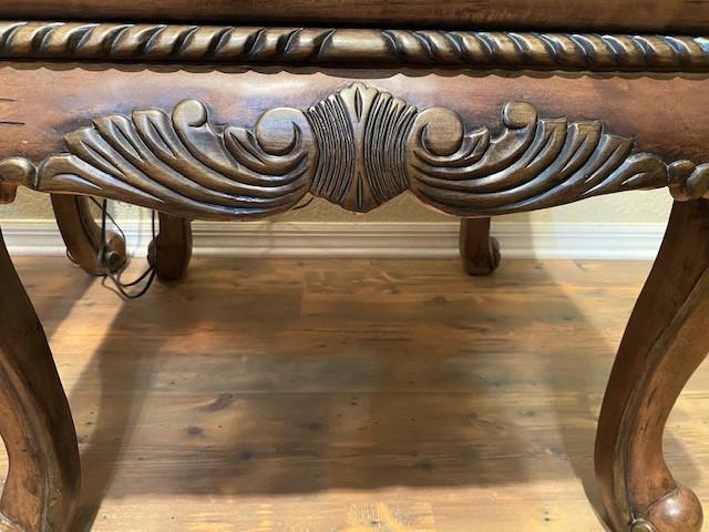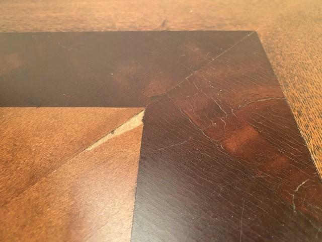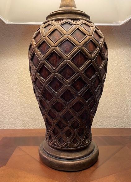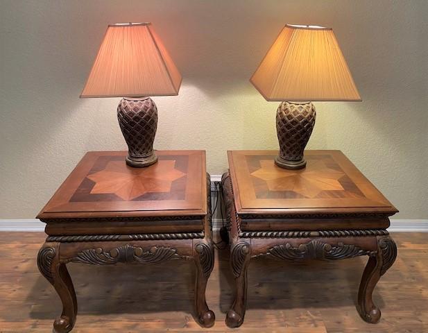 Missing piece of inlay on one table (pictured). Estimated weight of lot: 40lbs. Measurement: 28"W x 28"D x 25"H (table; each) | 26"H (lamp; each)