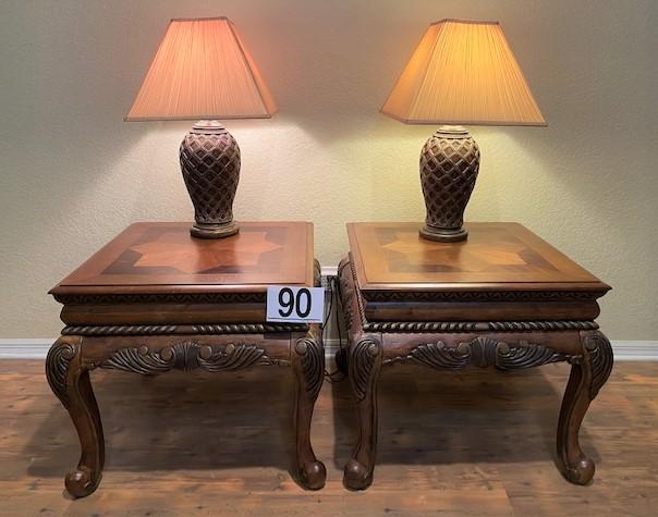 LOT#90LR: Pair of Inlaid End Tables with Lamps