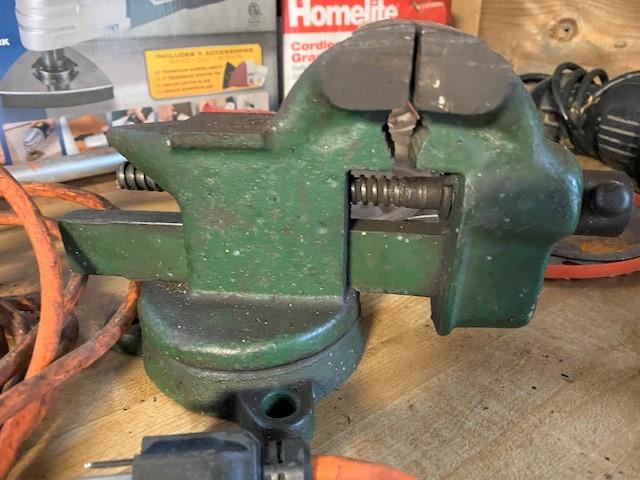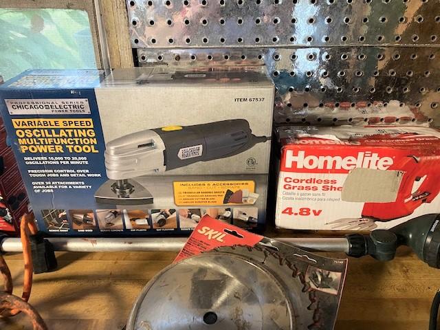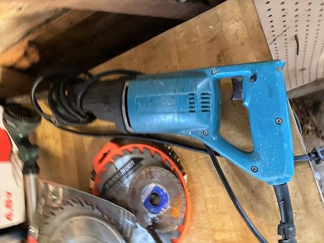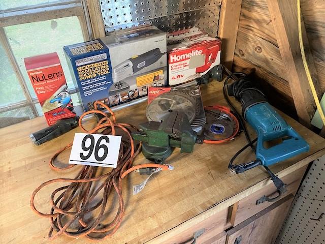 Saw blades, Makita sawzall, Dunlap 3"vice,extention cord & more. Estimated total lot weight: 30lbs. Measurement: 17"L x 6"H (SawZall)