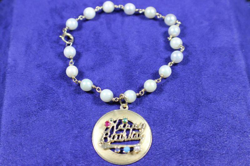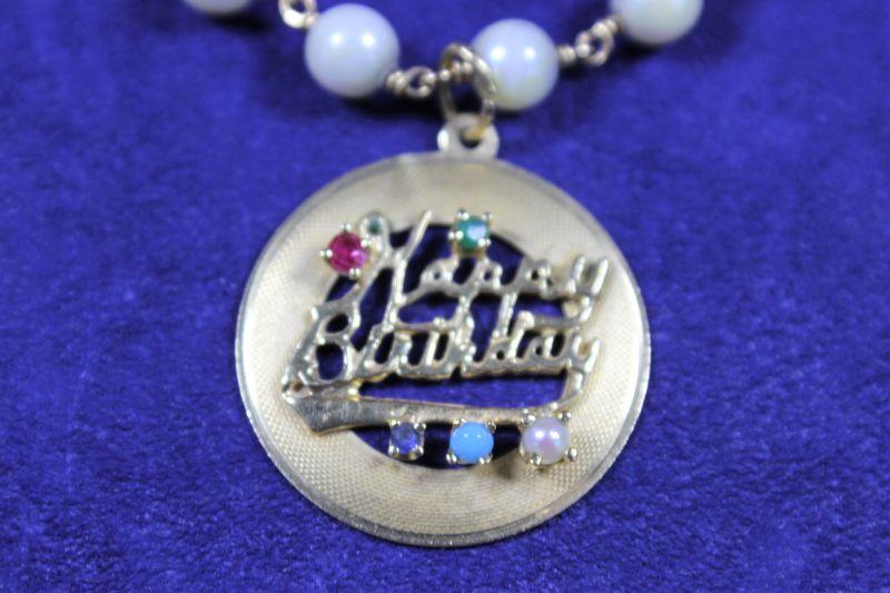Yellow toned. Attached "Happy Birthday" pendent also stamped 14K Gold.