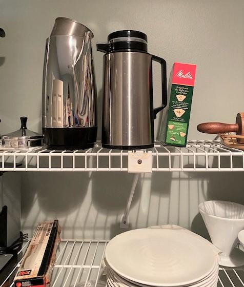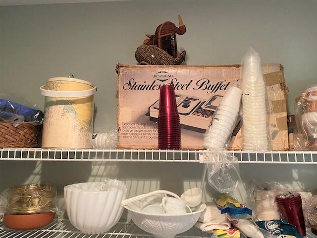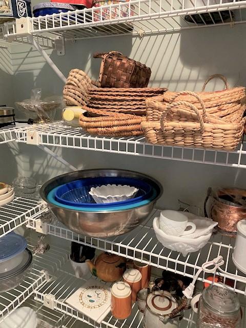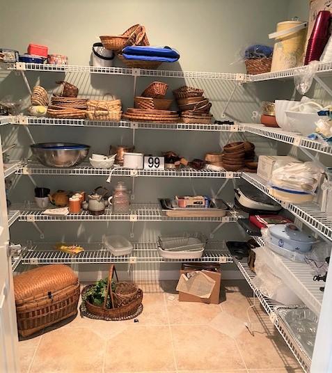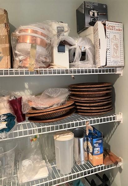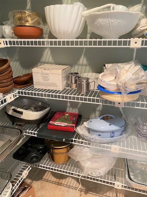 Includes: wicker baskets, crock pot, food processor, electric skillets, coffee pots, grinder, chafing tray, cloth napkins, ice bucket, stock pots & more.