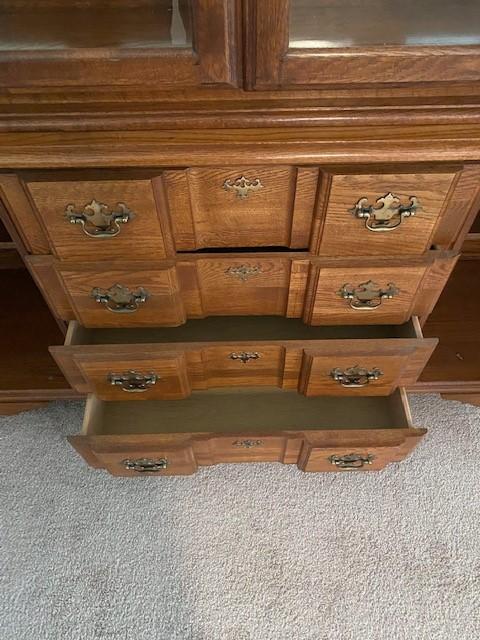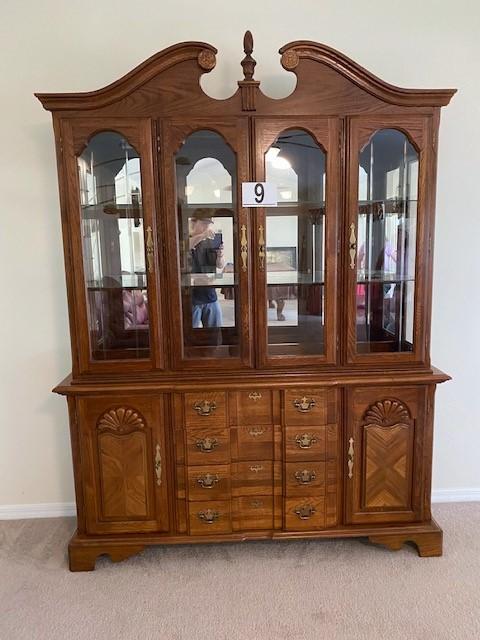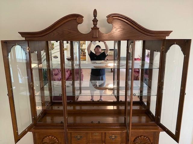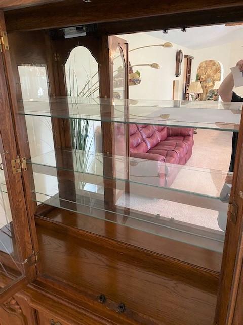 Two piece. Has four glass doors. Measurement: 88"H x 67"W x 18"D