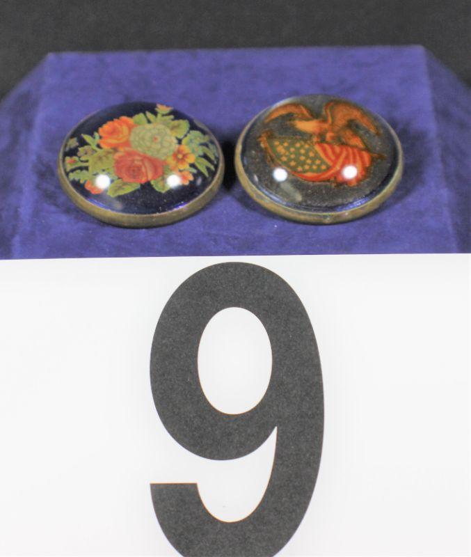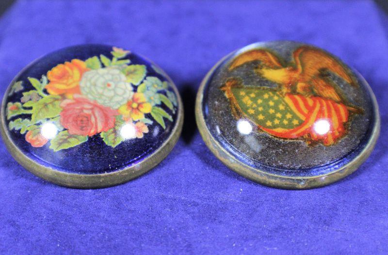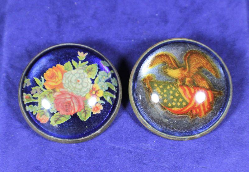 One patriotic theme; other assorted flowers. Probably reverse painted.