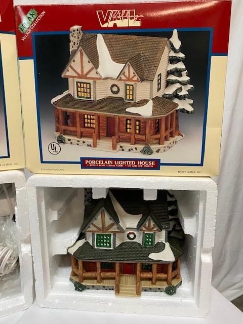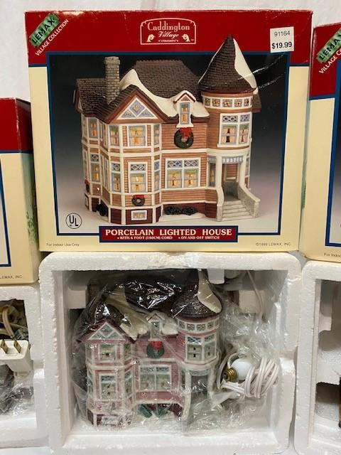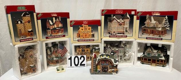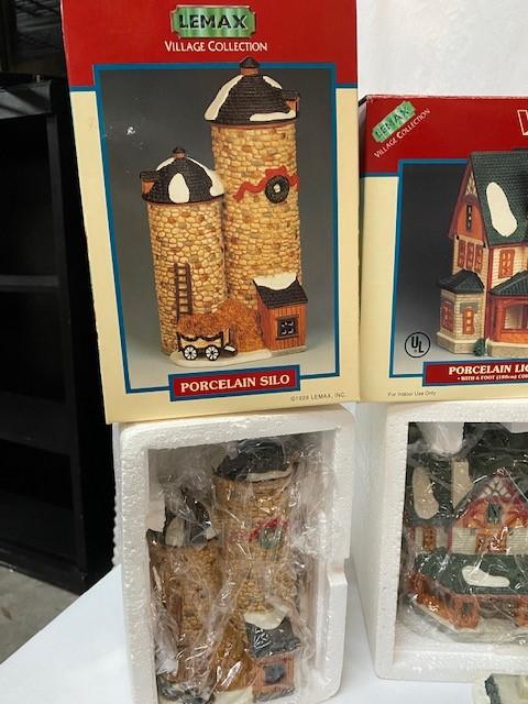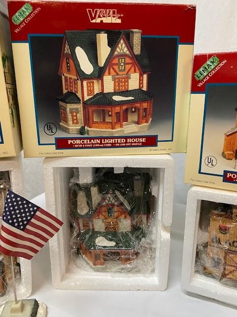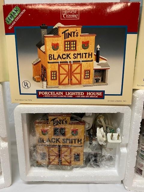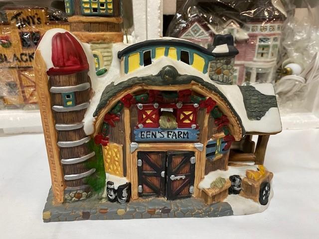 Flag pole, one unboxed house showing signs of damage, Silo, Tiny's Blacksmith, & 3 assorted Lighted Houses