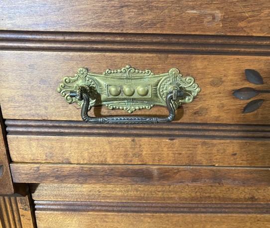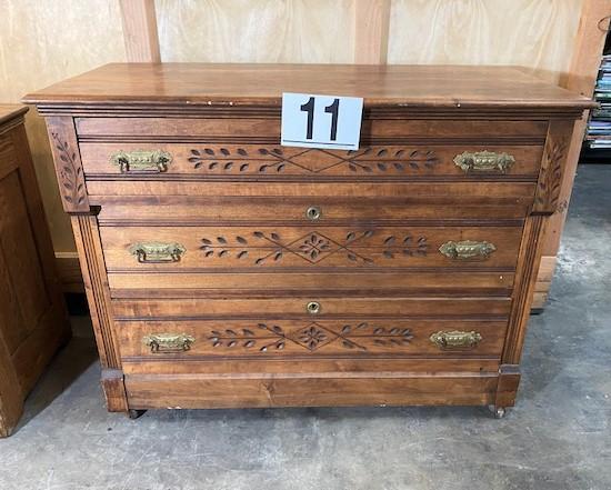 3 drawers. On casters. Appears to be original hardware. Measurement: 41"W x 20"D x 31"H