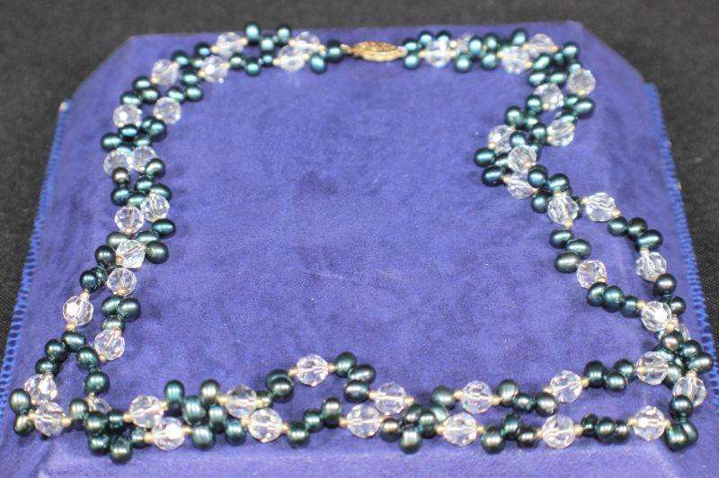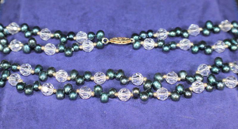 Pearls are teal in color. With alternating crystals. Measurement: 18"L