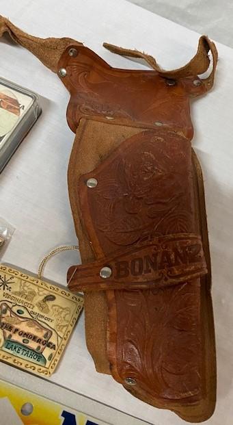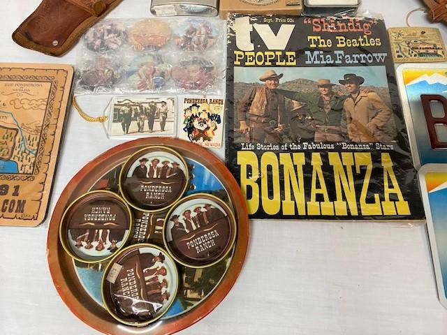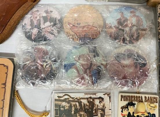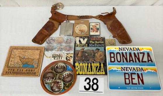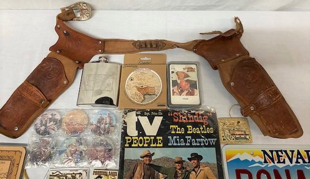 License plates, coaster set, People magazine, buttons, flask, playing cards, gun holster (appears to be NOS)