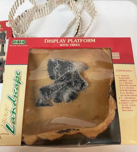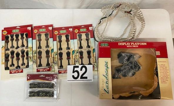 Street Lamps, Fences, display platform with trees & wooden picket fence.