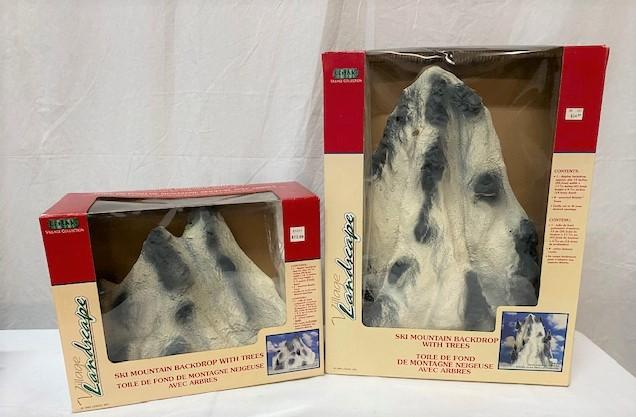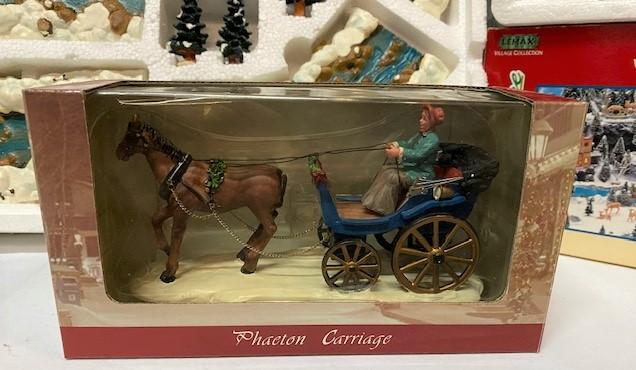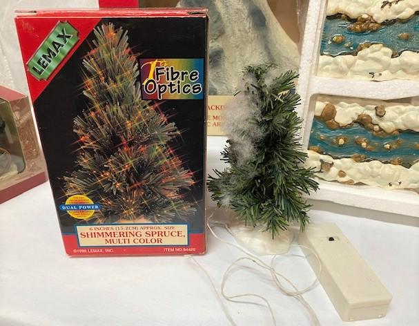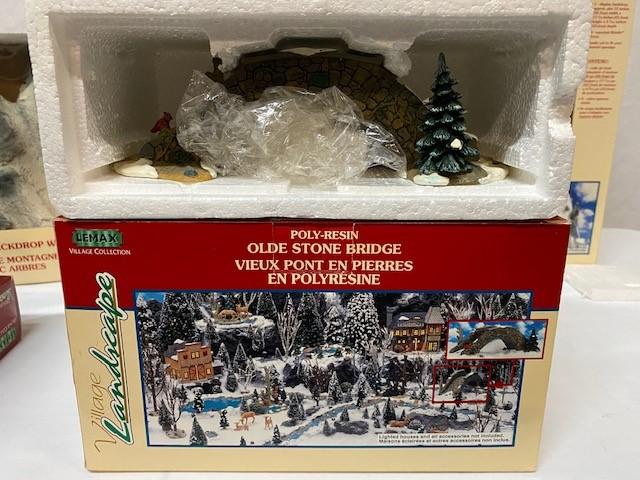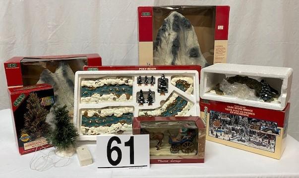 Old Stone Bridge, Shimmering Spruce, Fiber Optic Christmas Tree, Phaeton Carriage, Mill Stream set of 11 pieces & (2) Ski Mountain Backdrop with trees