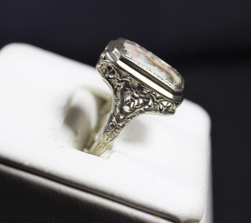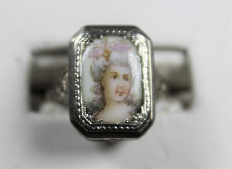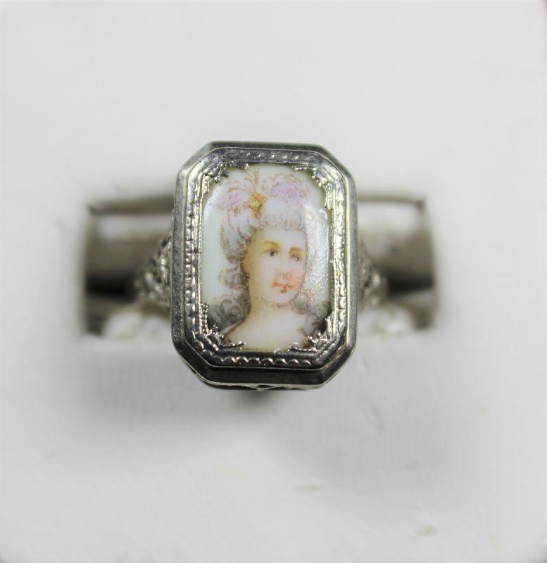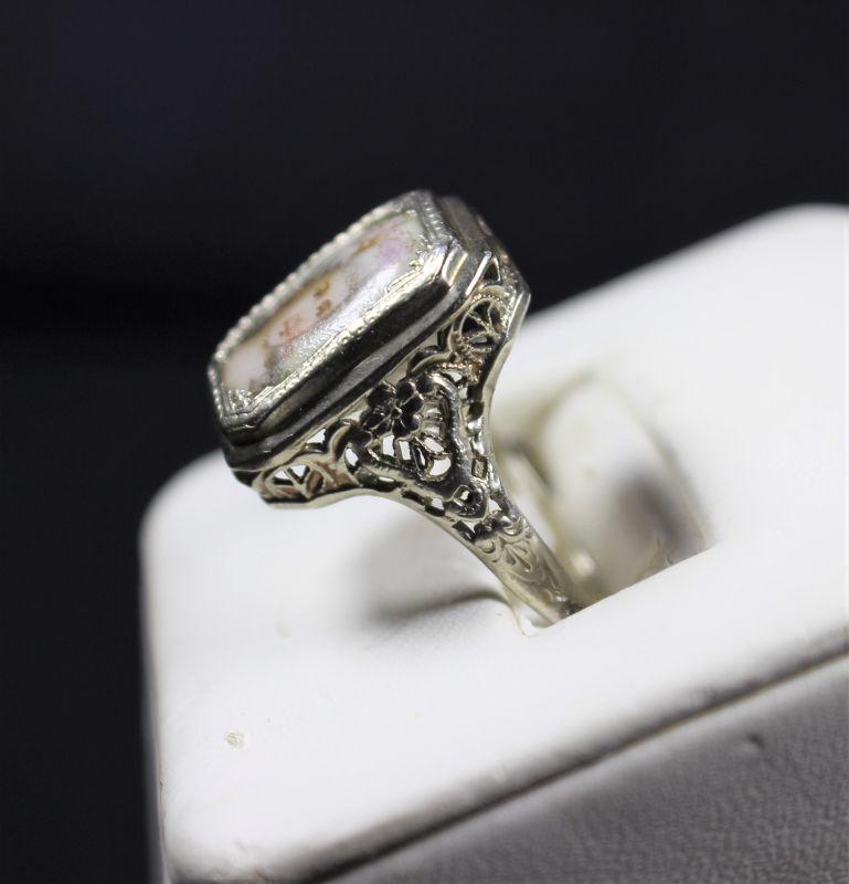 LOT#A62: Stamped 14K Gold Antique Filigree Portrait Ring 2.3g
