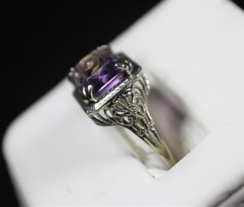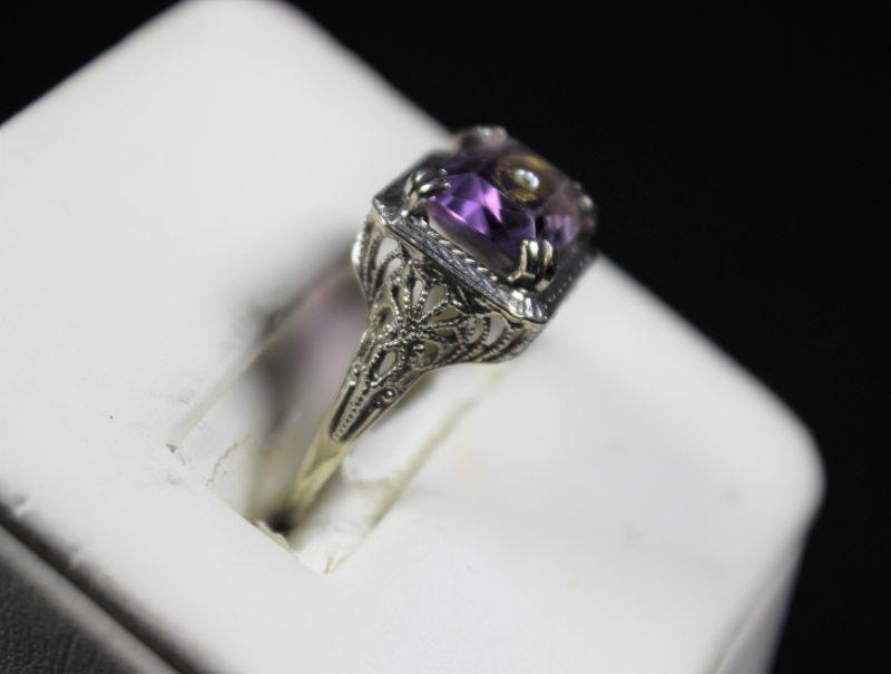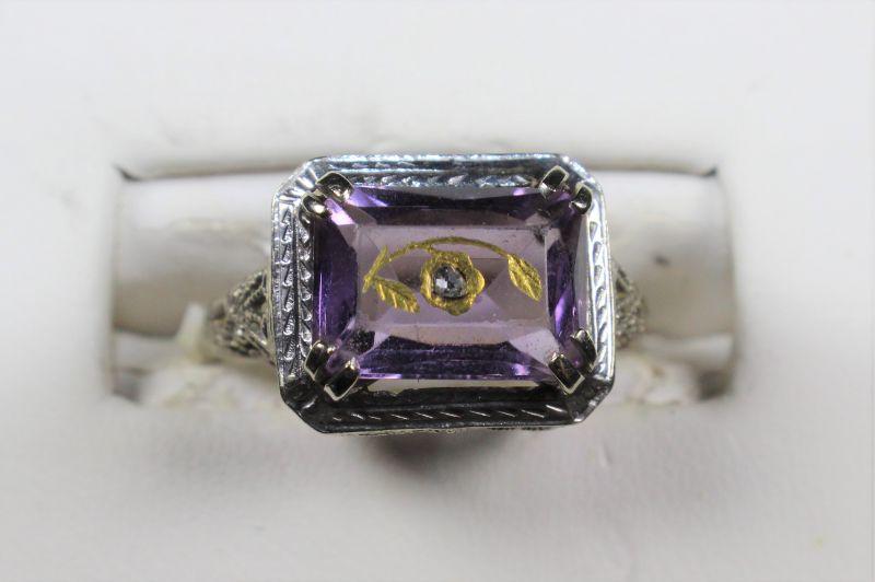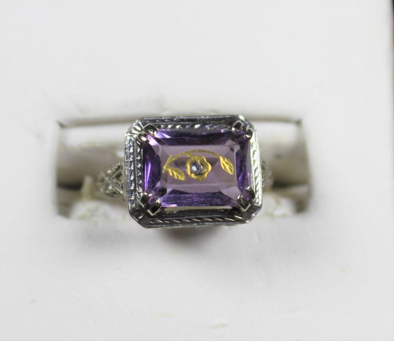 Size: 5.5. Believed to be Amethyst stone with gold rose inlay.
