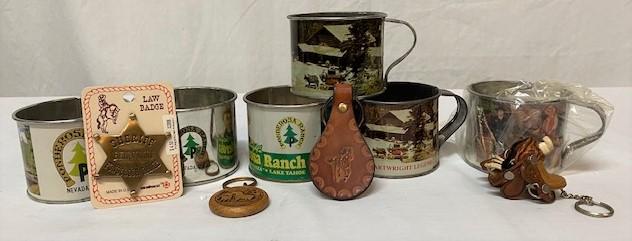 Includes: 6 tin litho cups, 3 key chains & a law badge.