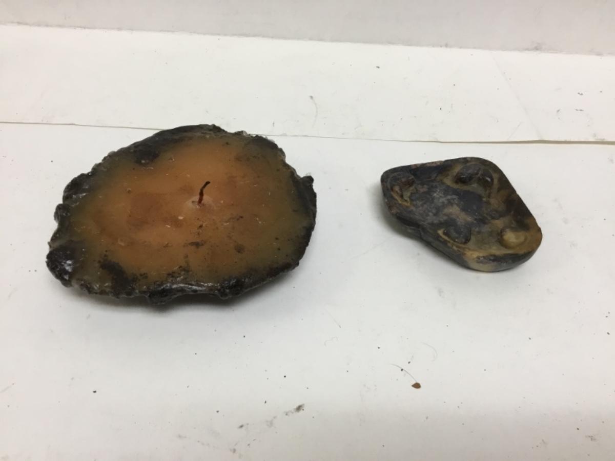 Faux rock candle and rock ashtray. Ashtray looks like soapstone or something similar, China is etched into the bottom. Under 4" size.