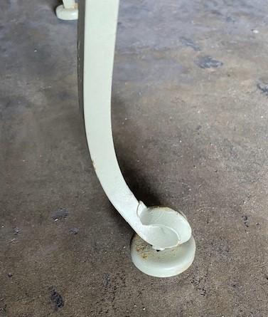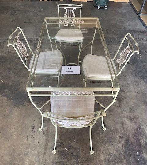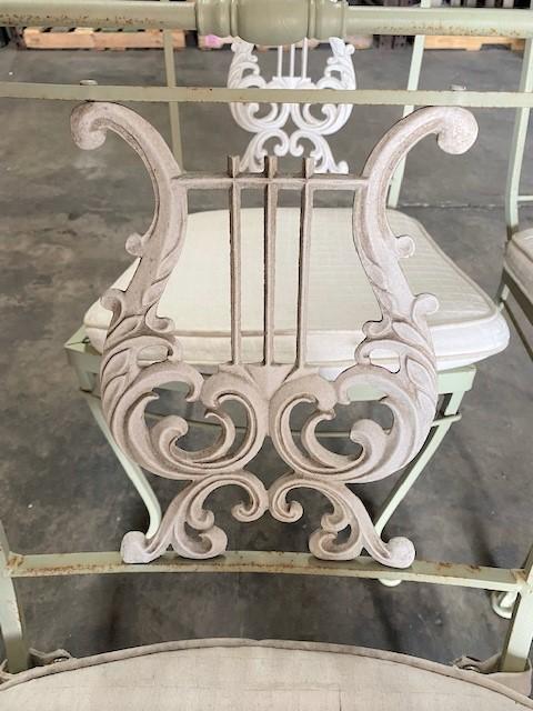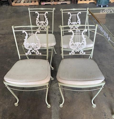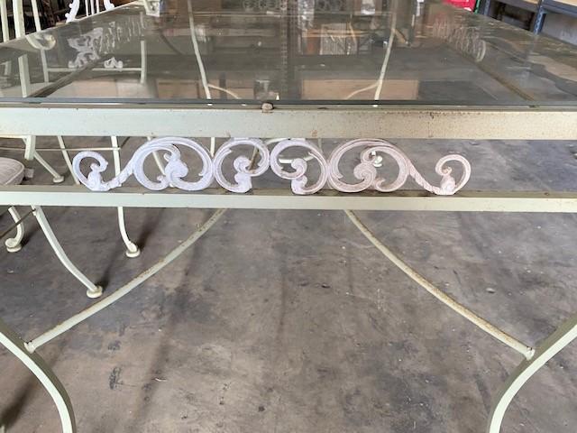 Celery green with some surface rusting. Estimated weight of lot: 100 lbs. Measurement: Table 60"L x 32 1/2" W Chairs (each) 32"tall x 17 1/2"W