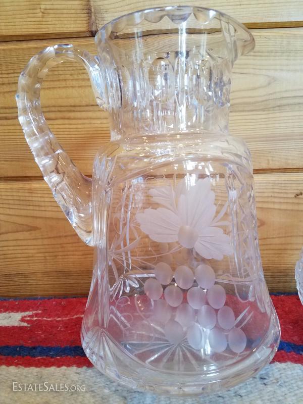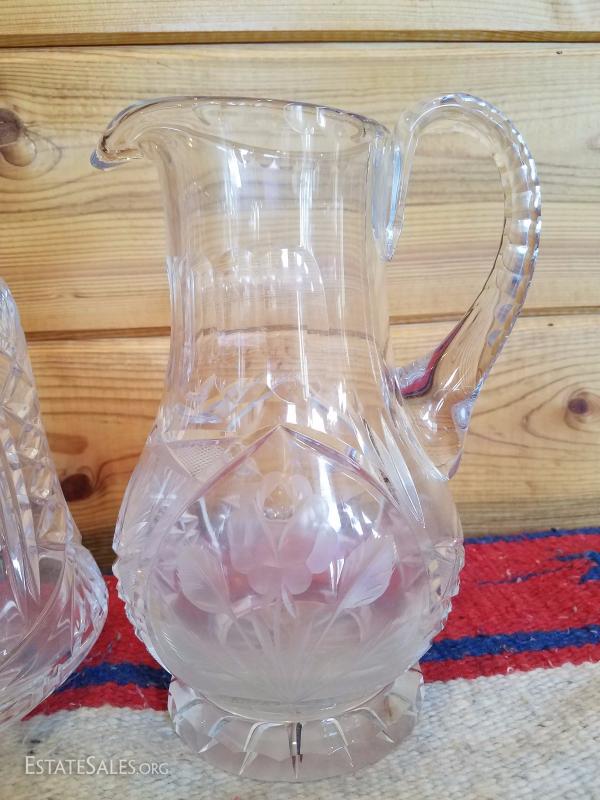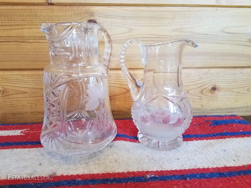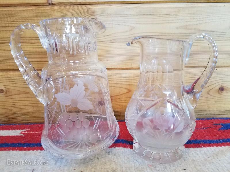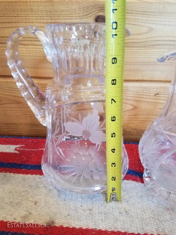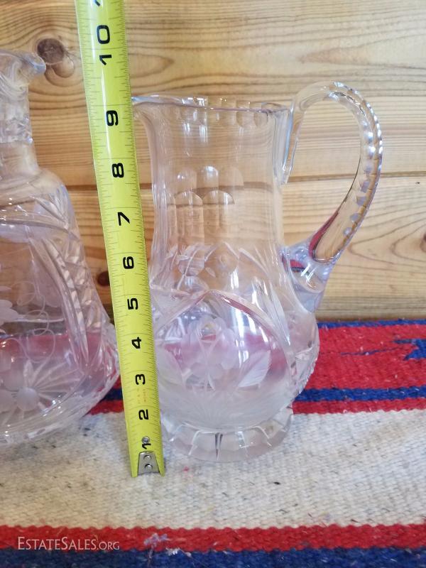 Lot-B15 Pair of 2 Pc Frosted Etched Glass Crystal Pitchers