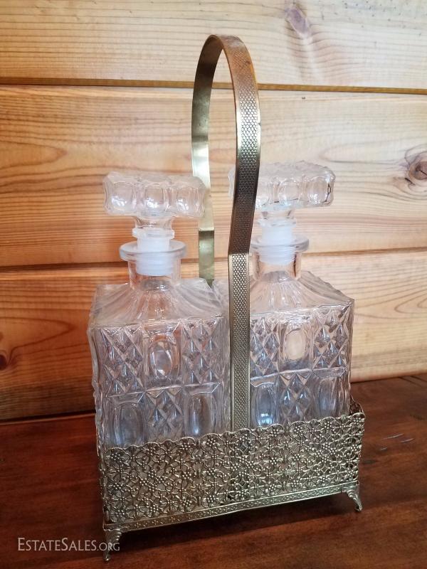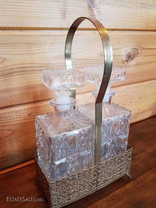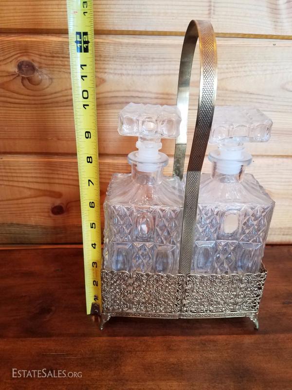 Lot-B62 Pair of Art Deco Liquor Crystal Glass Decanters w/ Holster