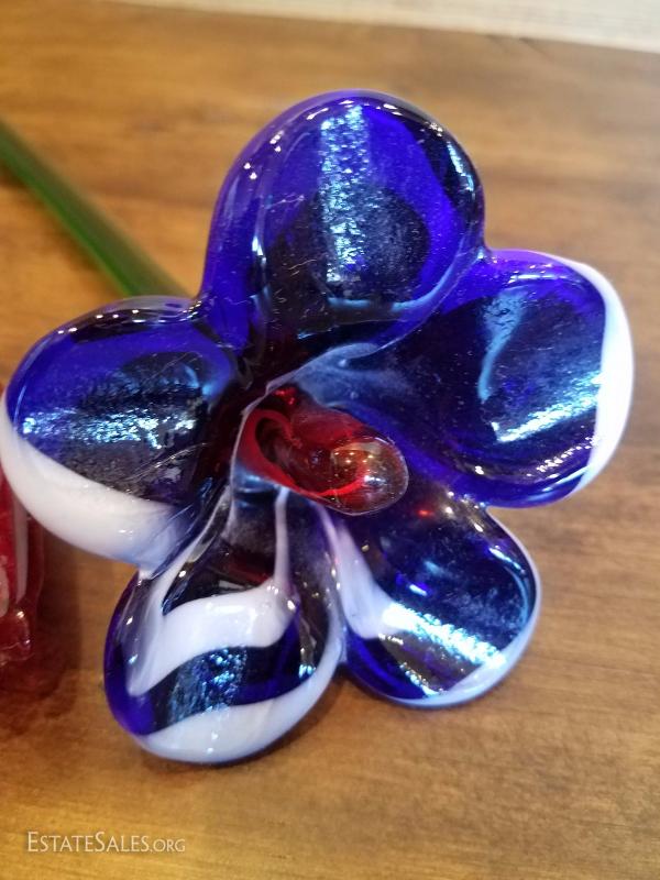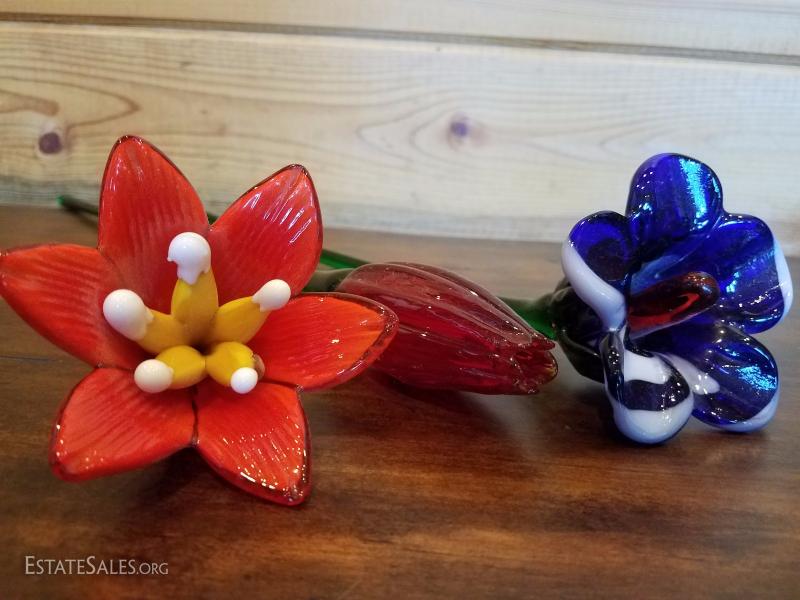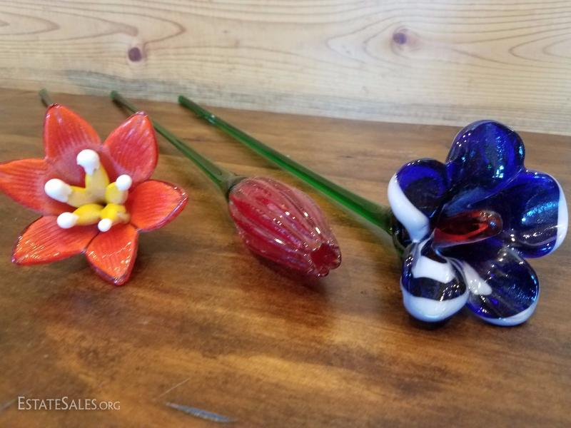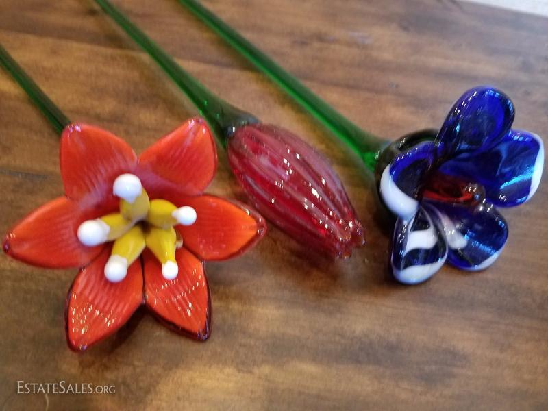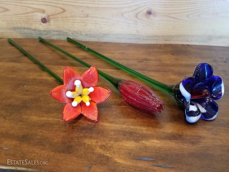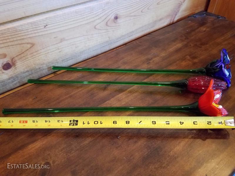 Lot-B65 3 Pc Hand Blown Long Stem Flowers