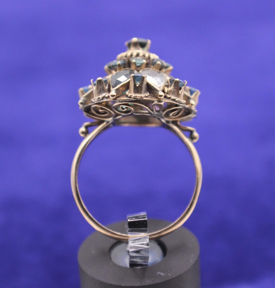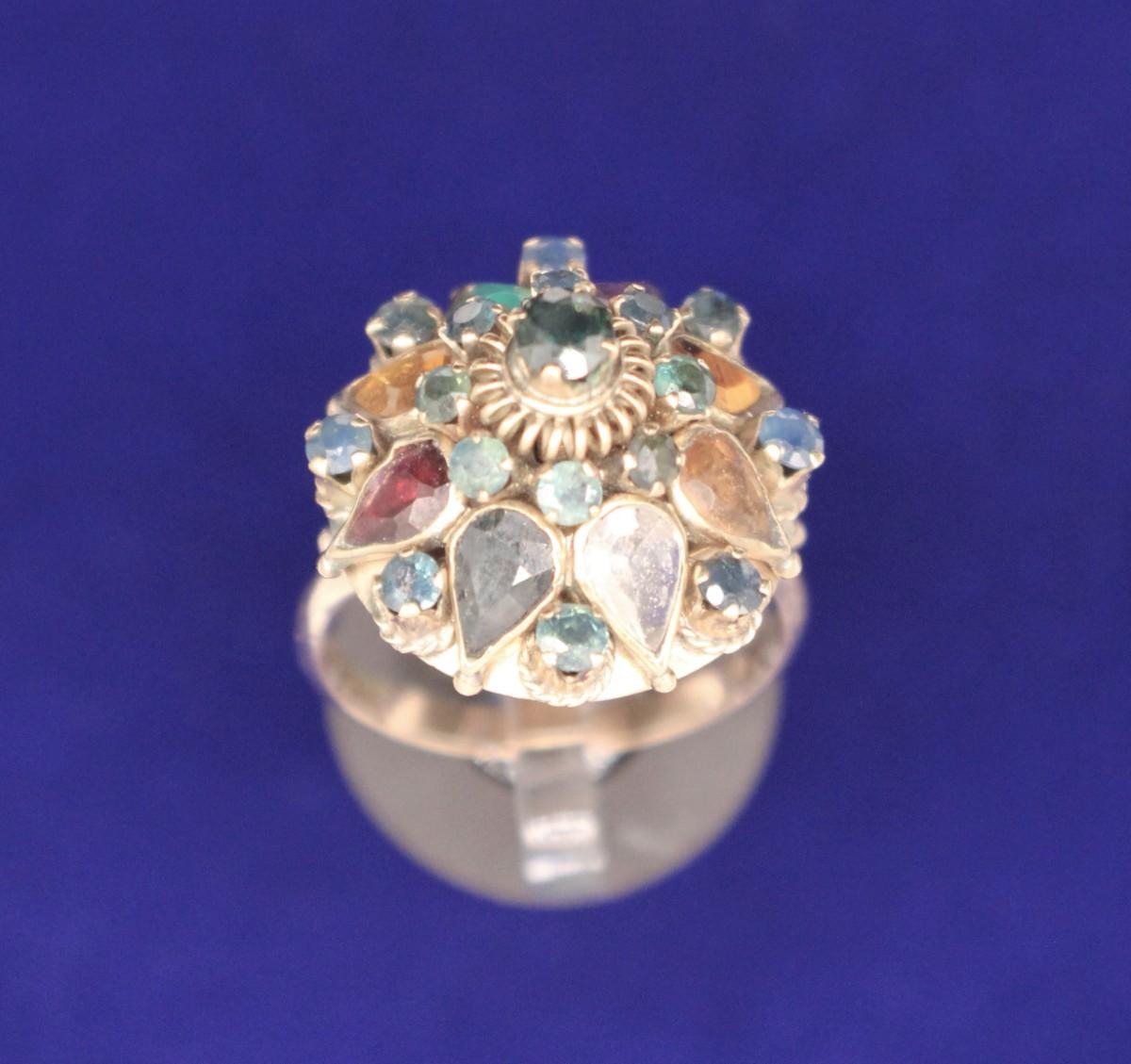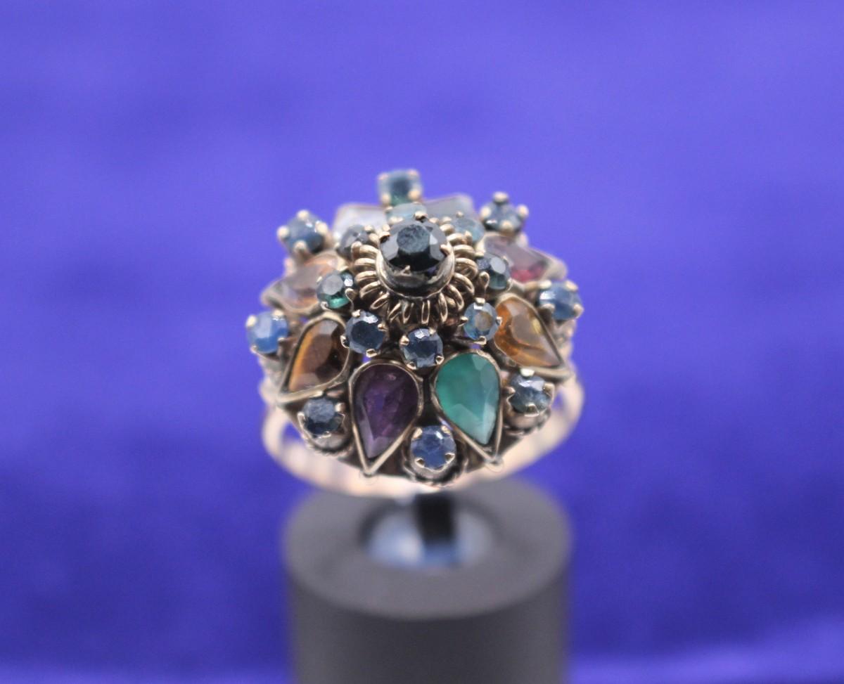 Size 9. "Sapphire" confirmed with Gemoro Ultra Tester3.. Gold content at 35%. Niton XRF analyzer used to check gold purity. Colored accent stones (other than sapphires) are semi precious gemstones
