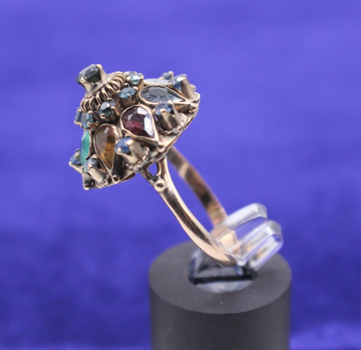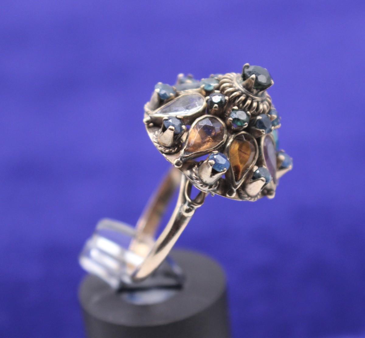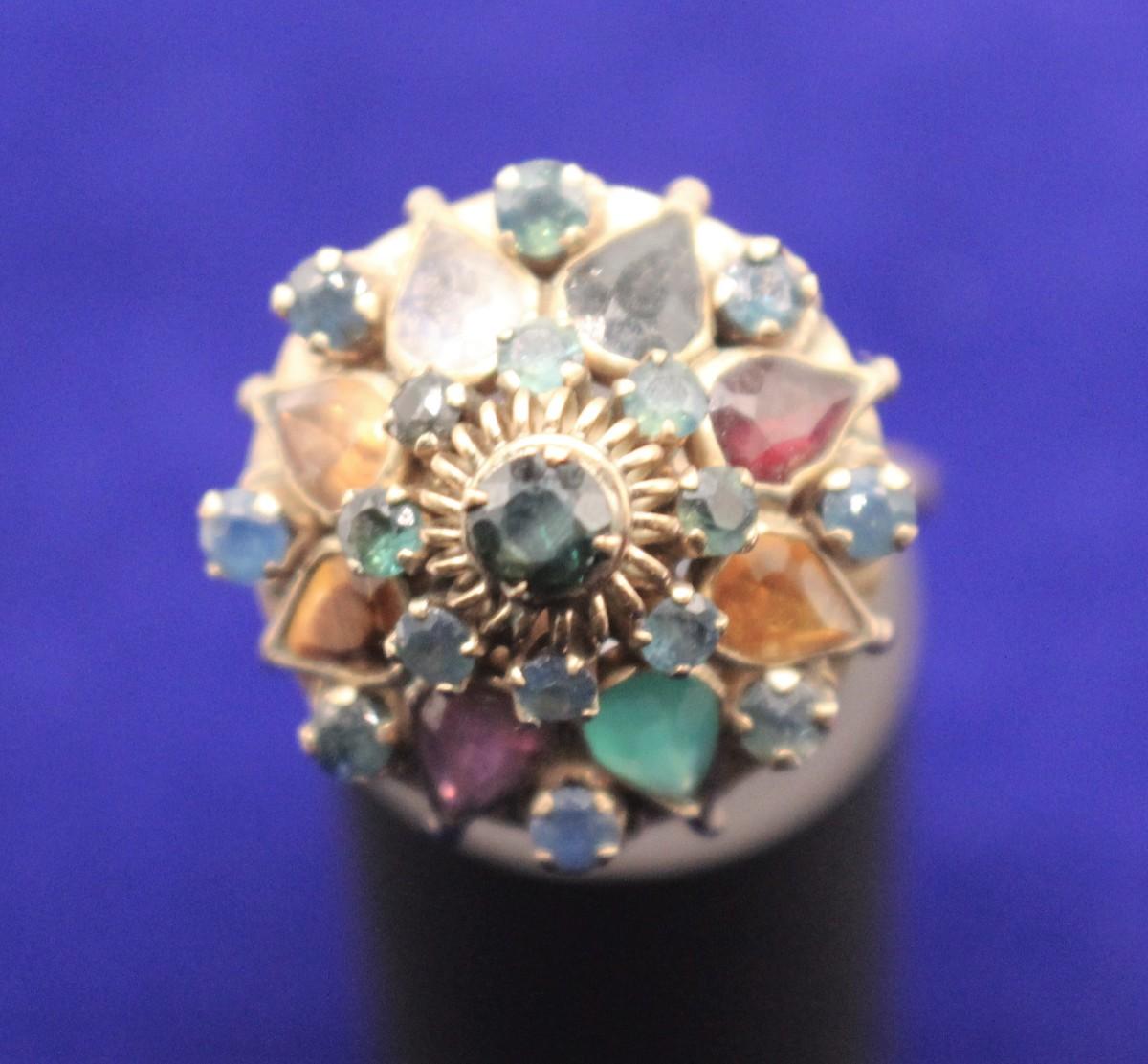 Size 9. "Sapphire" confirmed with Gemoro Ultra Tester3.. Gold content at 35%. Niton XRF analyzer used to check gold purity. Colored accent stones (other than sapphires) are semi precious gemstones