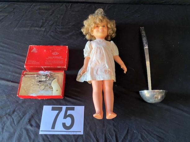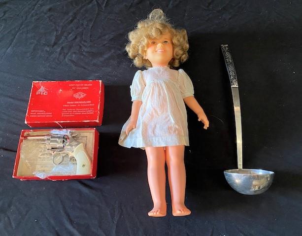Includes Shirley Temple doll, Italian Silverplate Ladle. Revolver is NOS.