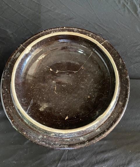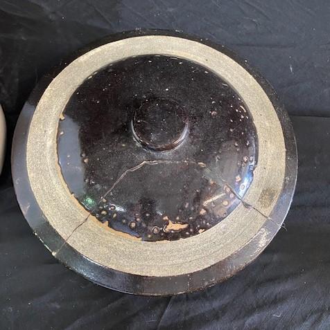 Lid is cracked. Glazing imperfections. Measurement: 15" x 12 1/2" diameter.