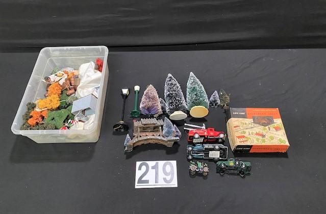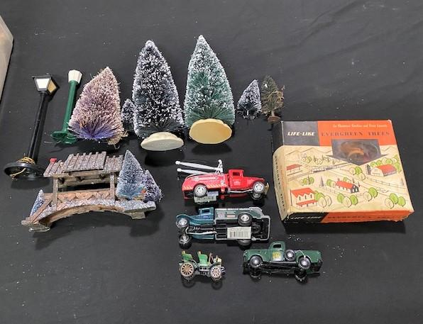 Includes: trees, shrubs, light post, cars, covered bridge. Estimated weight of lot: 5lbs. Measurement: 16" x 11" x 8" (largest item)