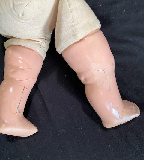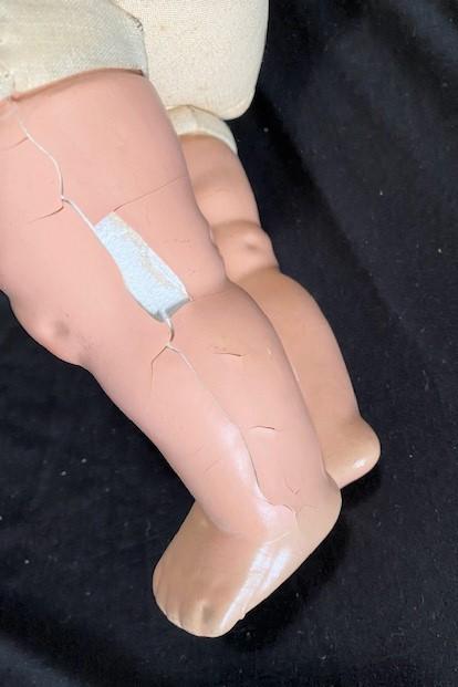 Believed to be German Bisque Doll. Some wear. Eyes blink. Measurement: 19" x 12"