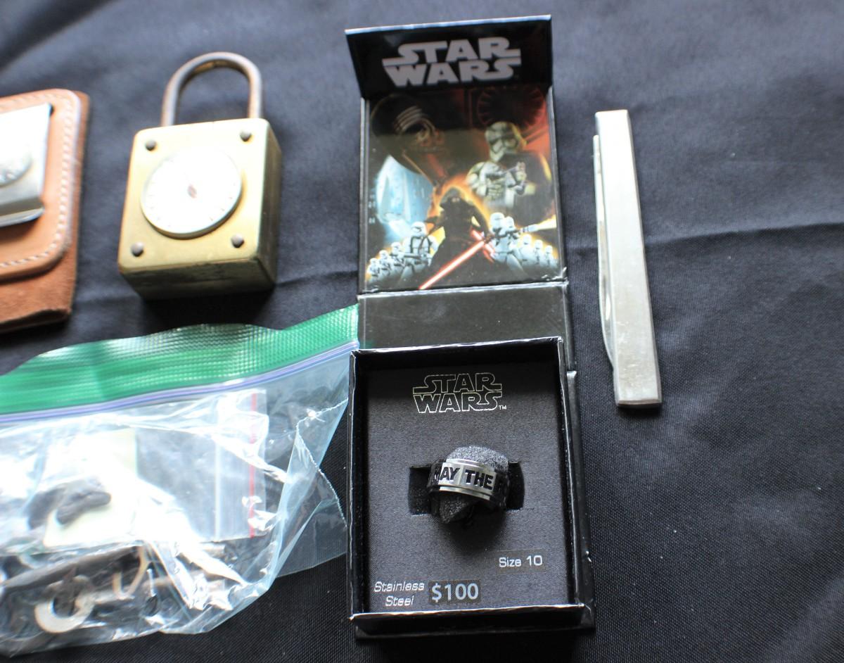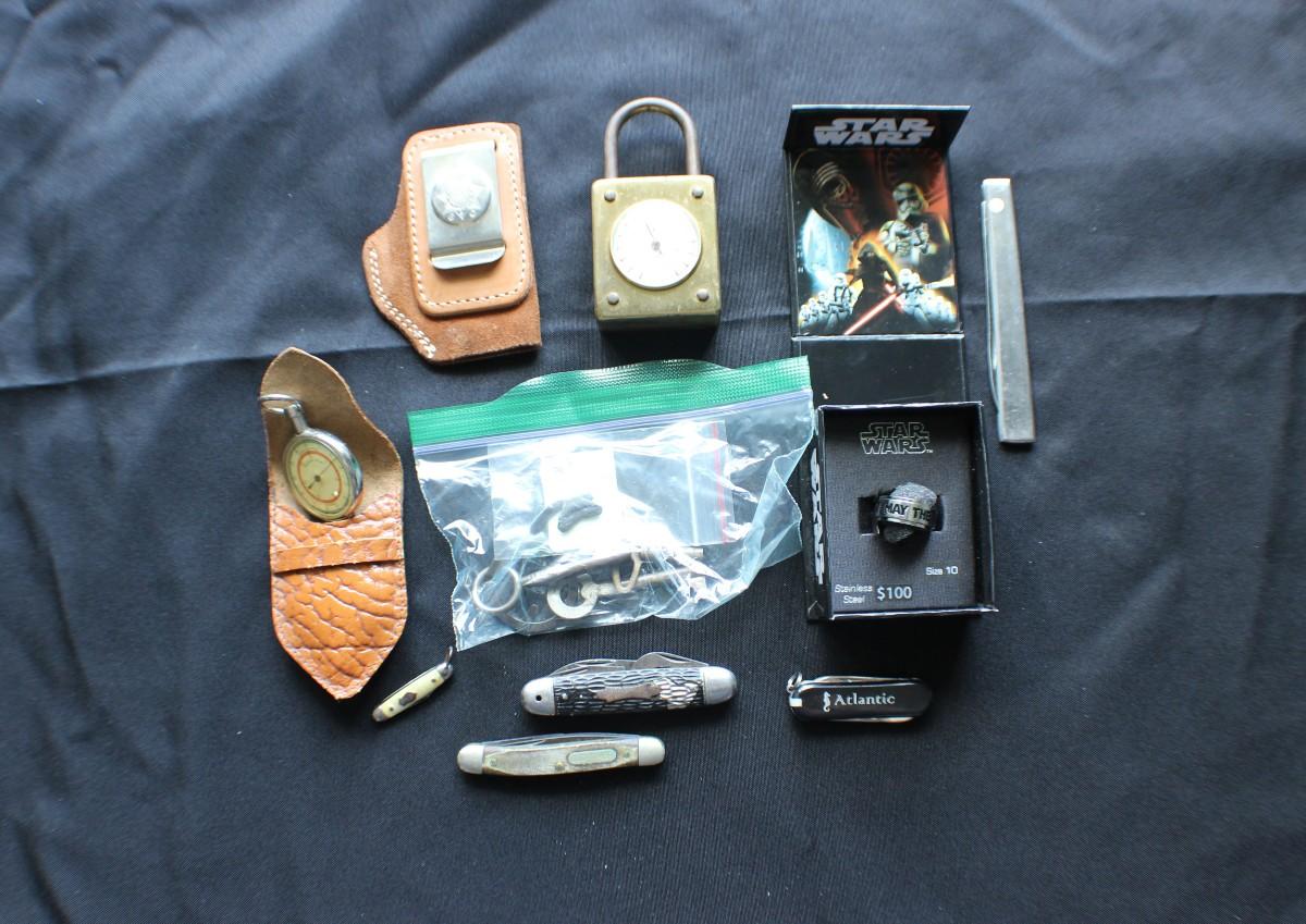 Includes: pocket knives, Star Wars ring, thermometers, compass & more.