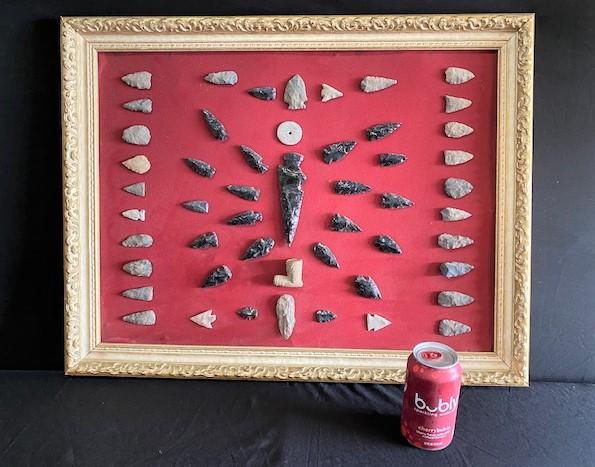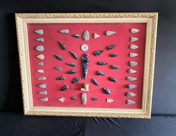 50+ in frame. Some flint, obsidian & more. Estimated weight of lot: 5lbs. Measurement: 5 3/4" (largest artifact) 27"LWx 21"L (frame)
