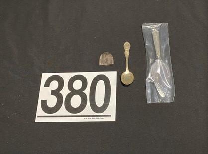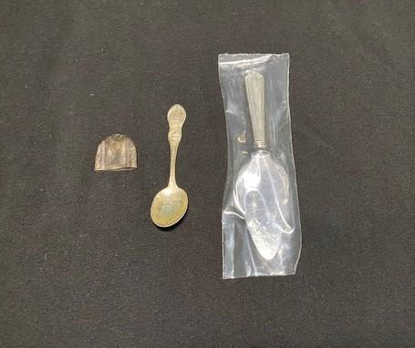 Includes: spoon, belt tip & cheese knife with sterling handle. Approximately 27grams. Estimated weight of lot: 1lbs. Measurement: 6" x 6" x 6"
