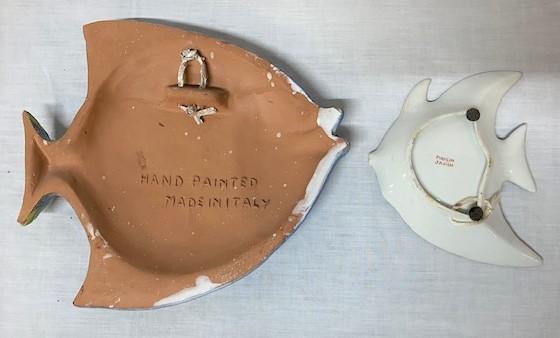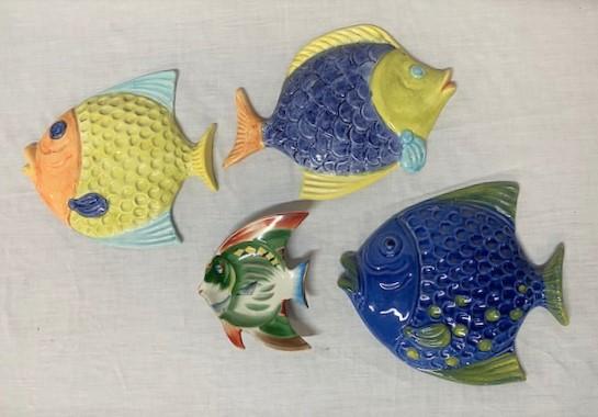 3 wall hanging ceramic fish hand painted in Italy. Fish pin made in Japan.