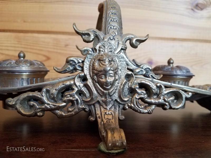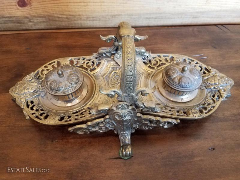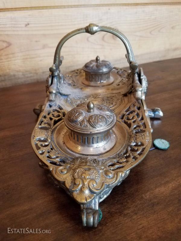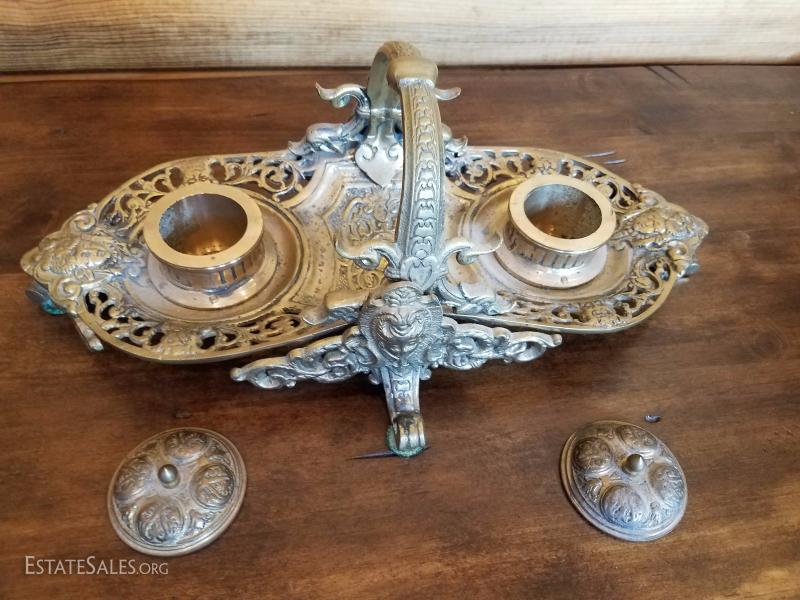 Lot-E11 Antique Solid Brass Footed Double Cup Ink Well Stand