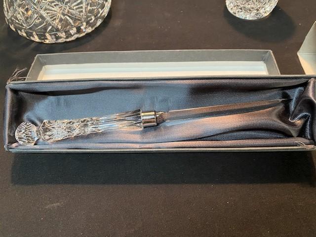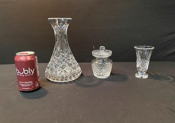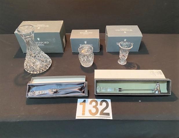 with Waterford boxes. Includes: carafe, candle snuffer, letter, honey pot, & vase. Estimated weight of lot: 15lbs. Measurement: 10"L x 6"W x 6"H (box; largest)