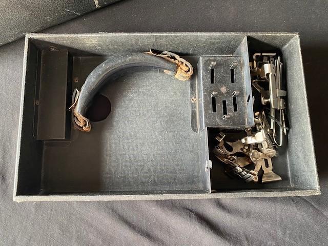 With key. Powers on at time of cataloging. Nickel plated. Handle broken on box. Estimated weight of lot: 20lbs. Measurement: 18"L x 12"H x 8"D