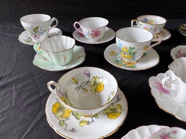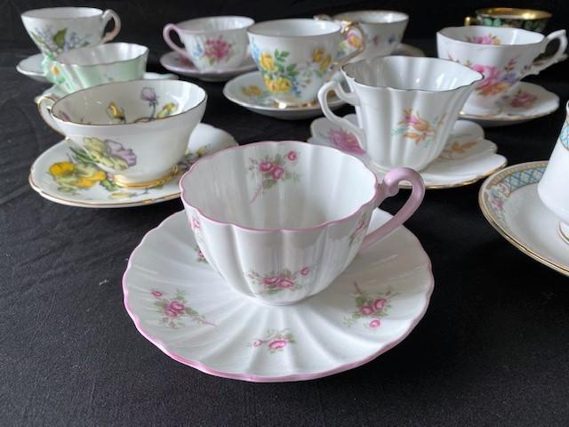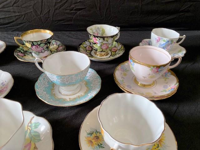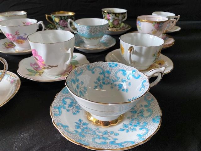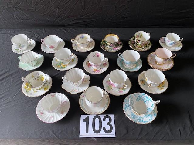 Regency, Royal Albert, Tuscan, Crown Prince, Paragon, Shelley, Royal Stafford, and more. One saucer is repaired (pictured).