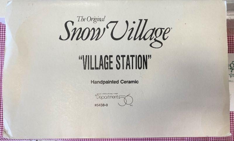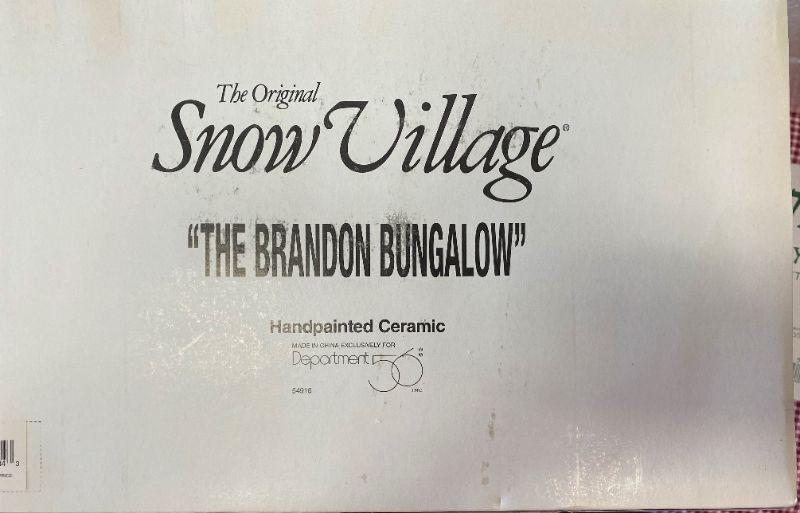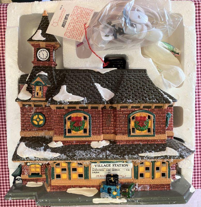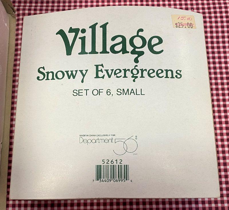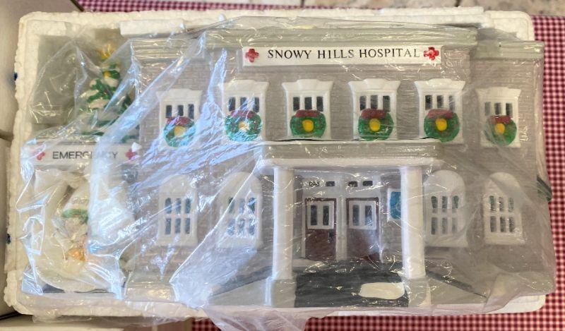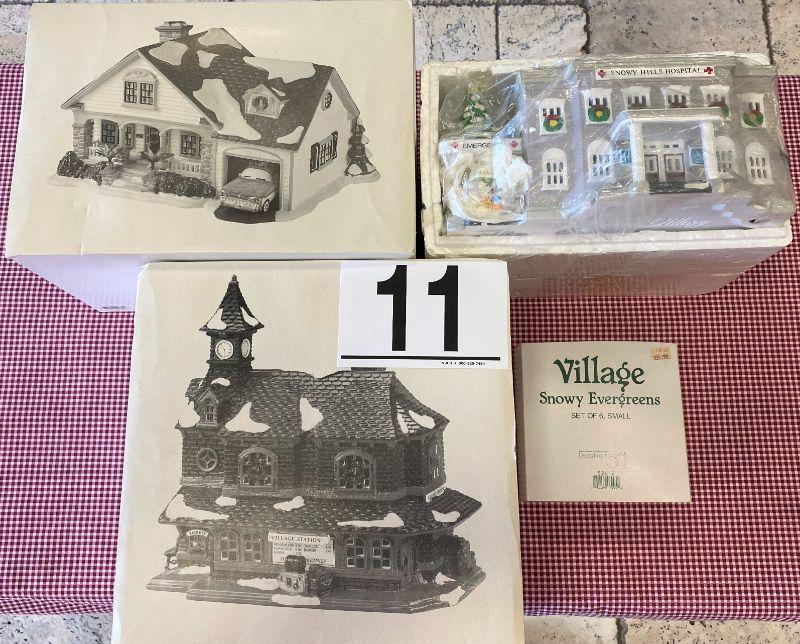 All Snow Village: Village Station, Brandon Bungalow, Snowy Hill Hospital & set of 6 Snowy Evergreens. Dimensions: (largest box) 12 1/2" L x 12"W.
