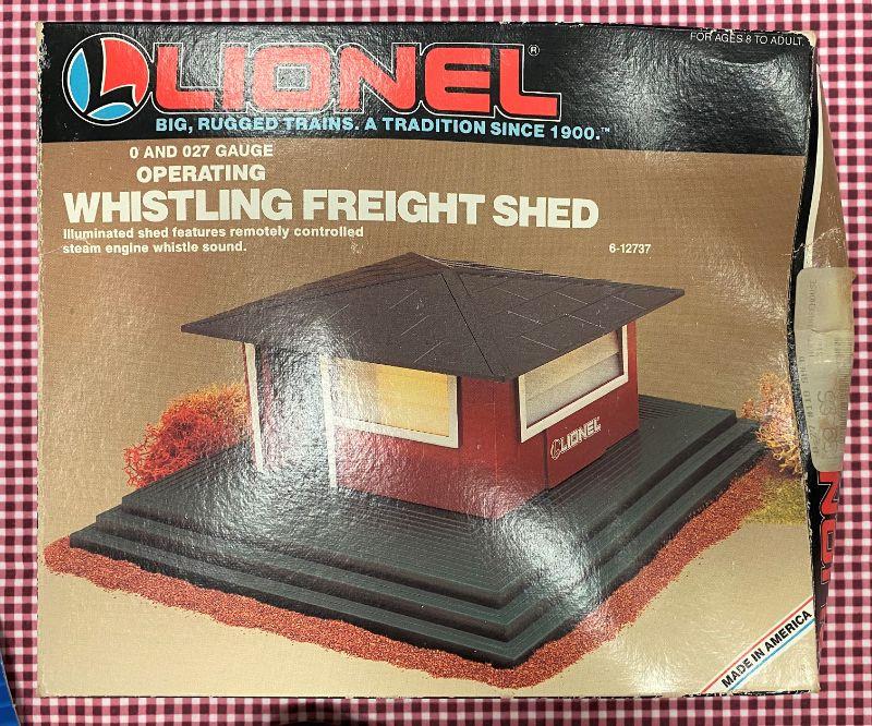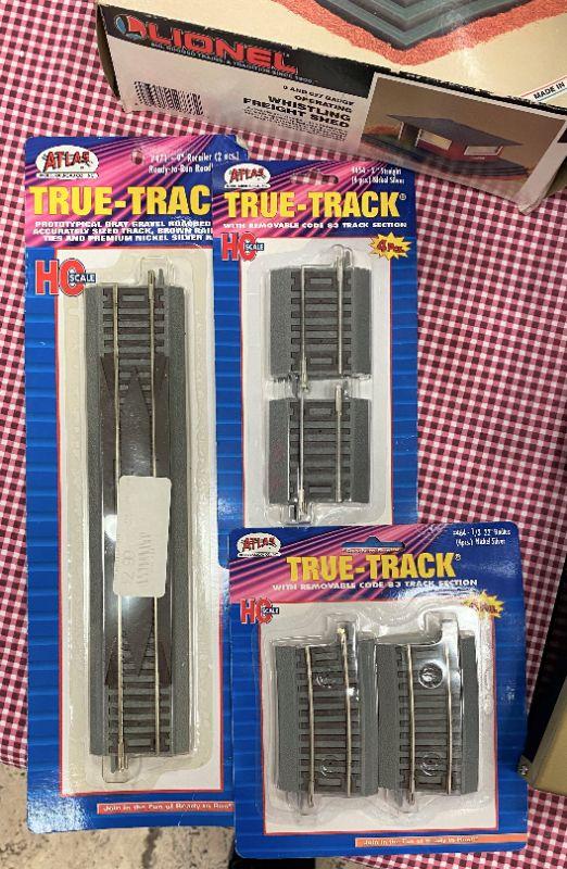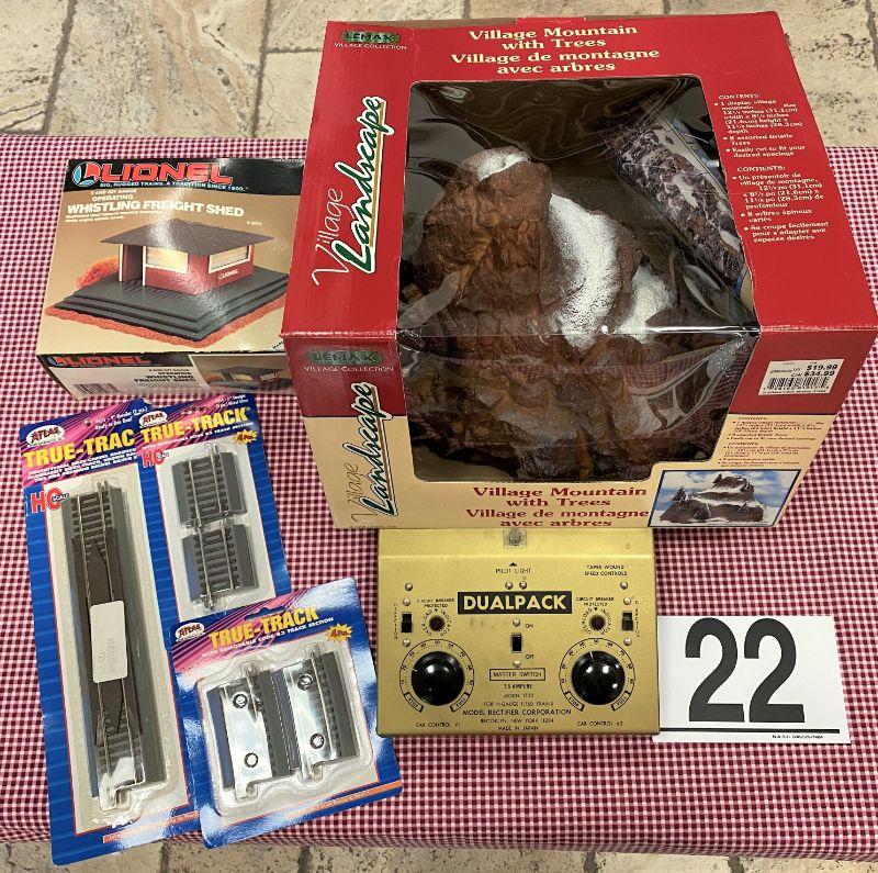 Village Mountain with Trees, some Atlas True tracks, Lionel Whistling Freight Shed & Dual pack Model 1722.