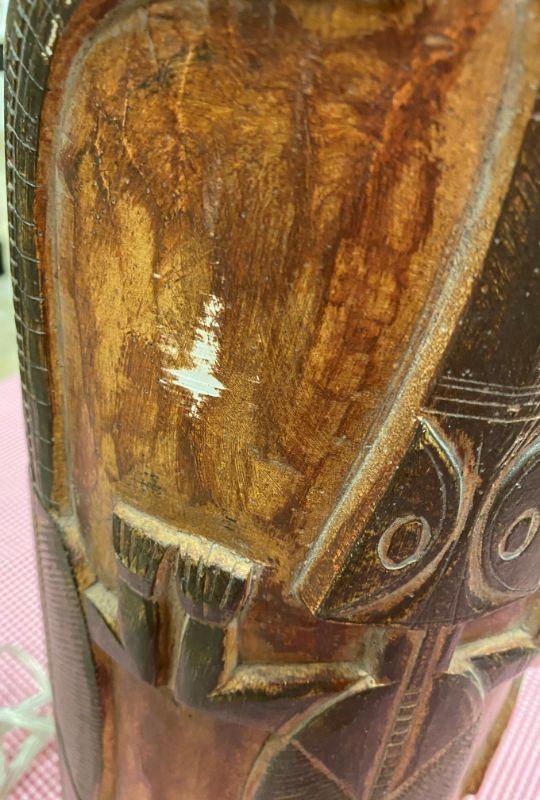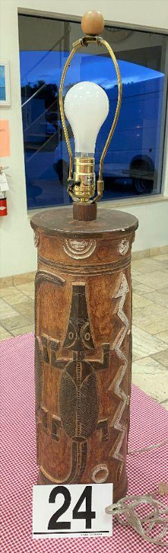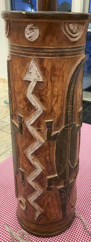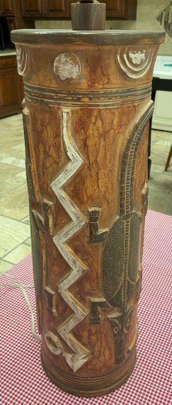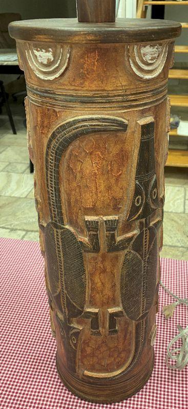 Stoneware lamp with native motif. Dimensions: 33"H x 7"diameter.