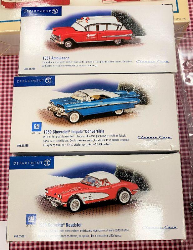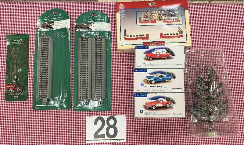 LOT#F28: Assorted Christmas Village Accessories including Department 56 Classic Cars