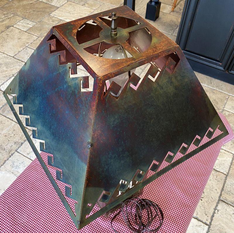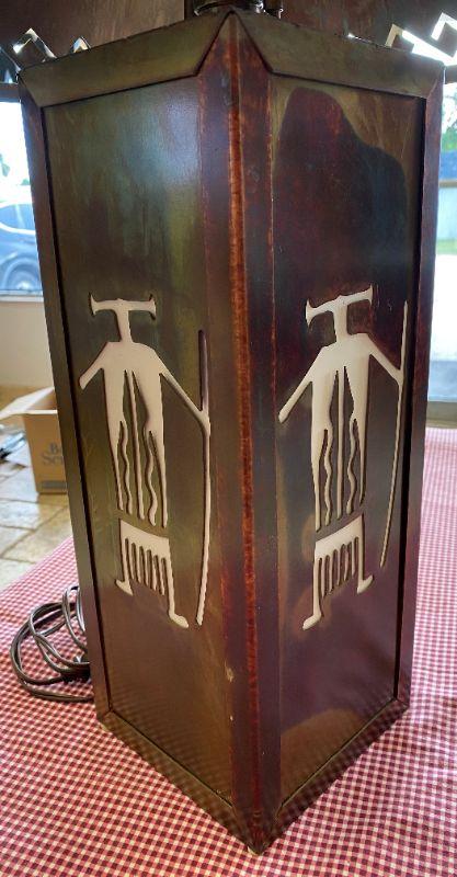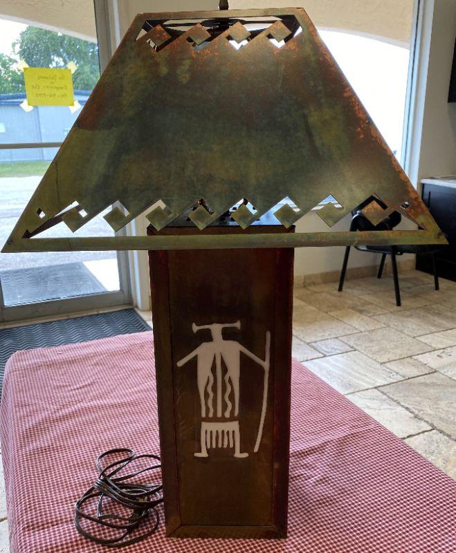 Patinated metal throughout with southwestern motif. Dimensions: 27"H x 15"w (at shade) 6"w ( at base)
