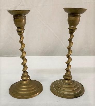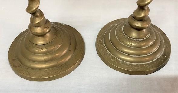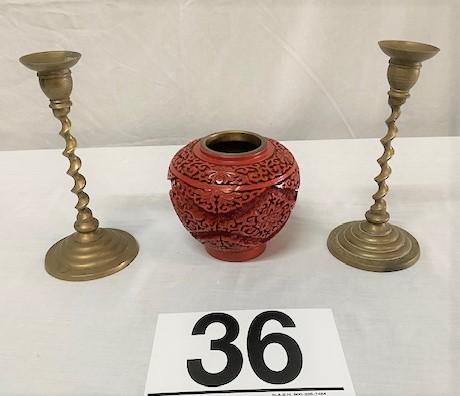 2 brass candle sticks & vintage cinnabar believed to be Chinese. Measurement: 7 1/2"H (candle sticks) 5"H x 5"W (cinnabar)