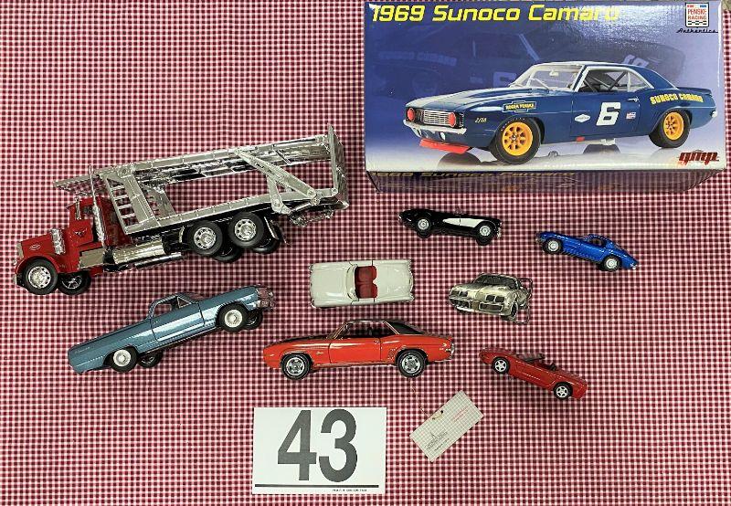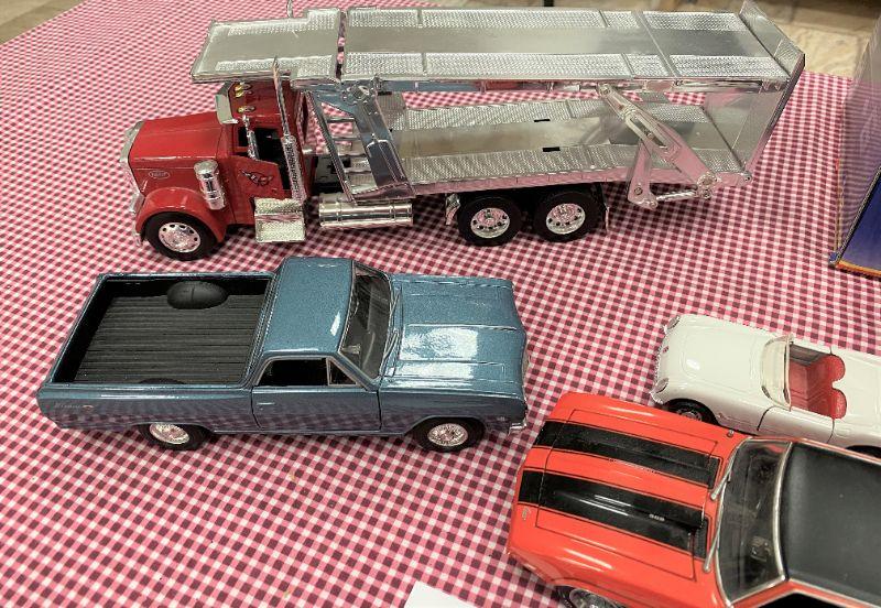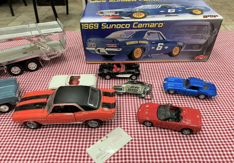 Assorted collectible diecast cars. Some unopened or with tags. Includes a belt buckle. Dimensions: (largest) 13 1/2"L x 6 1/2"W.