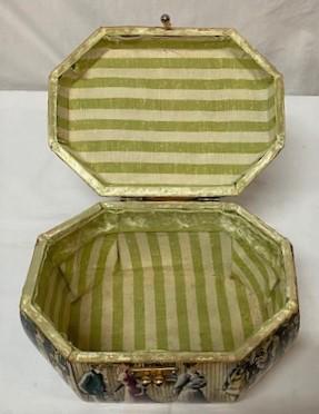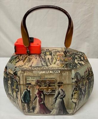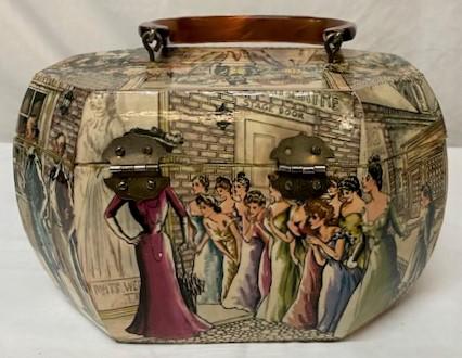 Victorian motif with phenolic handle. Latches shut. Minimal wear. Measurements: 9"L x 6"D x 5 1/2"W.