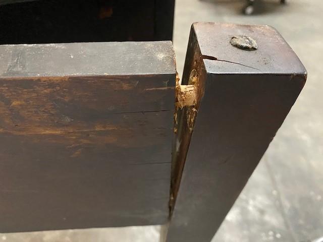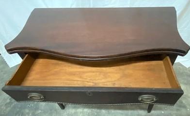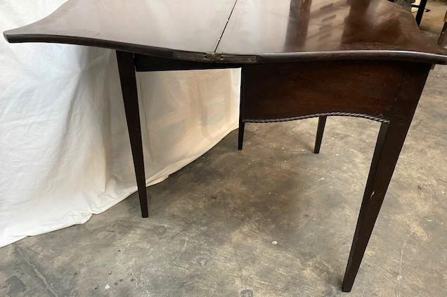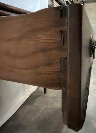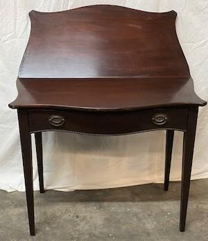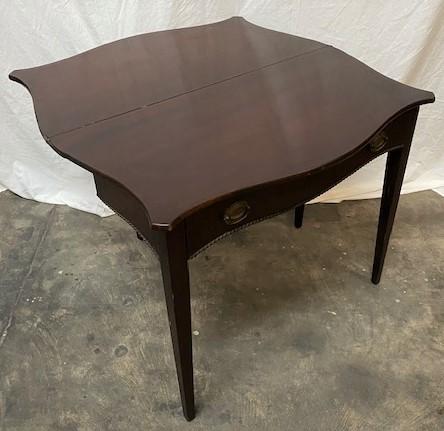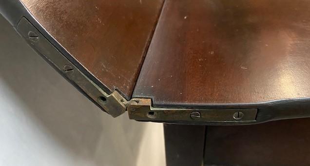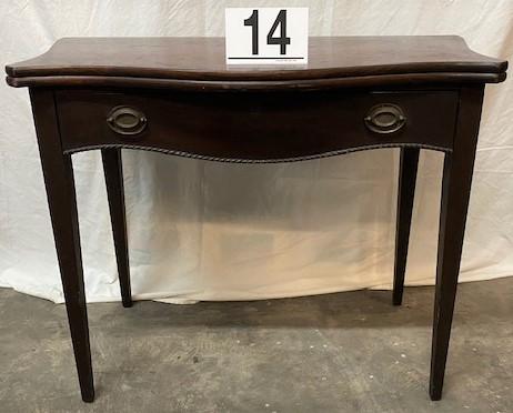 Fold over leaf. Loose leg. Faux key hole. Believed to be oak. One drawer. Measurements: 30"H x 30"W x 19"D (Closed) 38" (open).