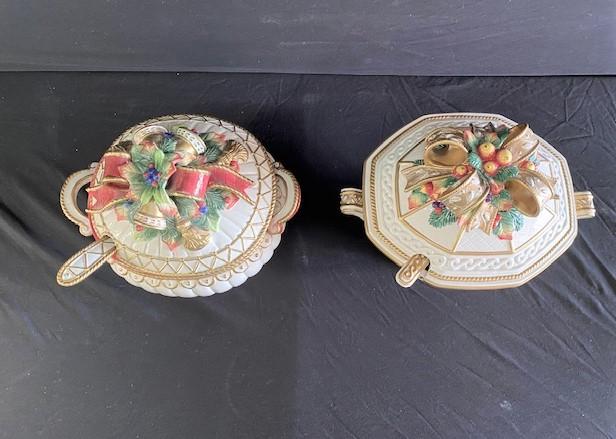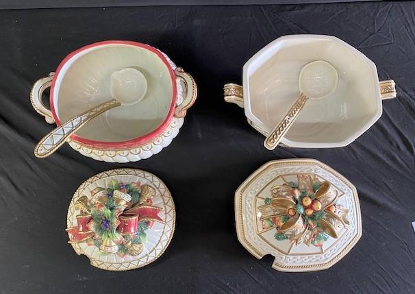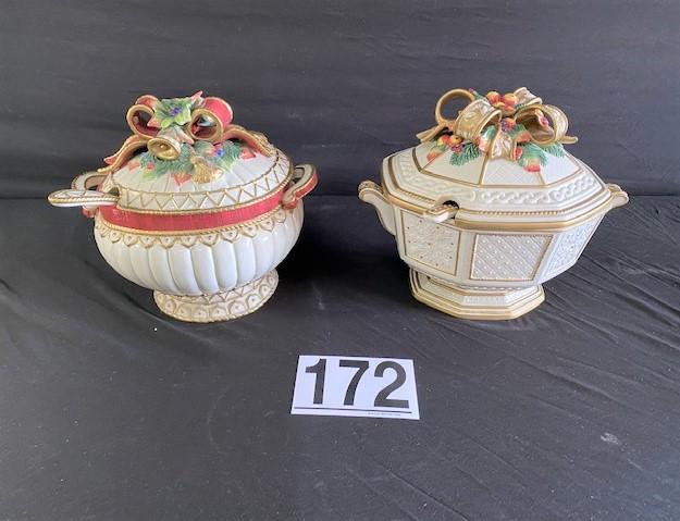 2 tureens w/ ladles. Estimated weight of lot: 8lbs. Measurement: 14 1/2"W x 11 1/2"H (largest w/ cover)