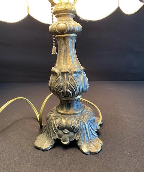 Pot metal base. Been repaired. Cracks in areas. Working at time of cataloging. Estimated weight of lot: 8lbs. Measurement: 16 1/2"H x 11"W