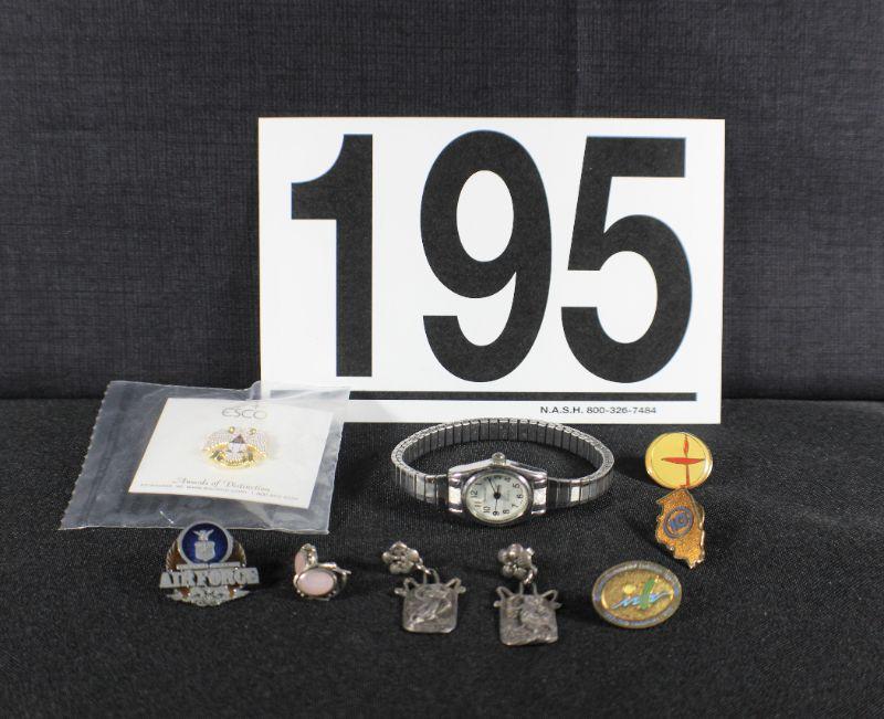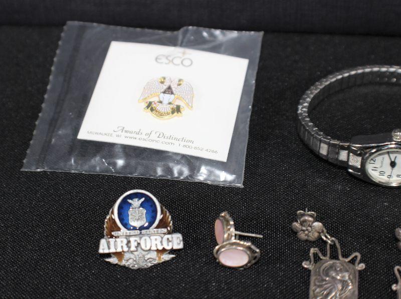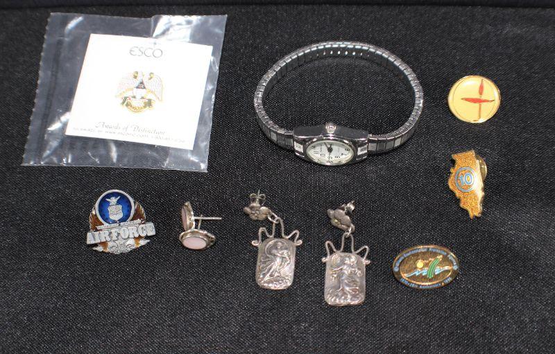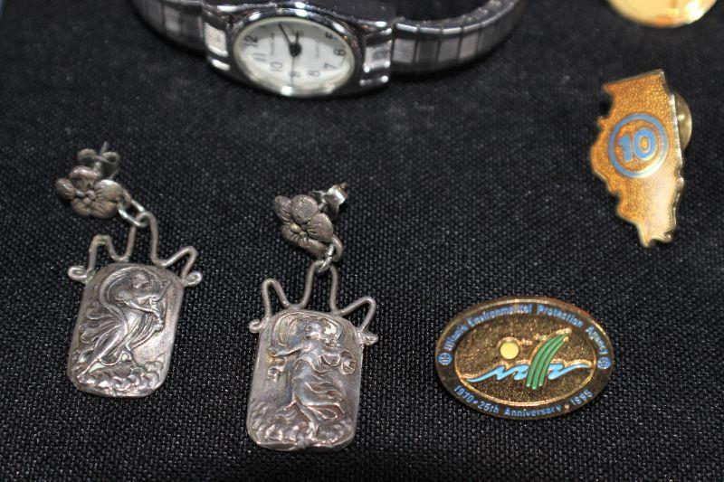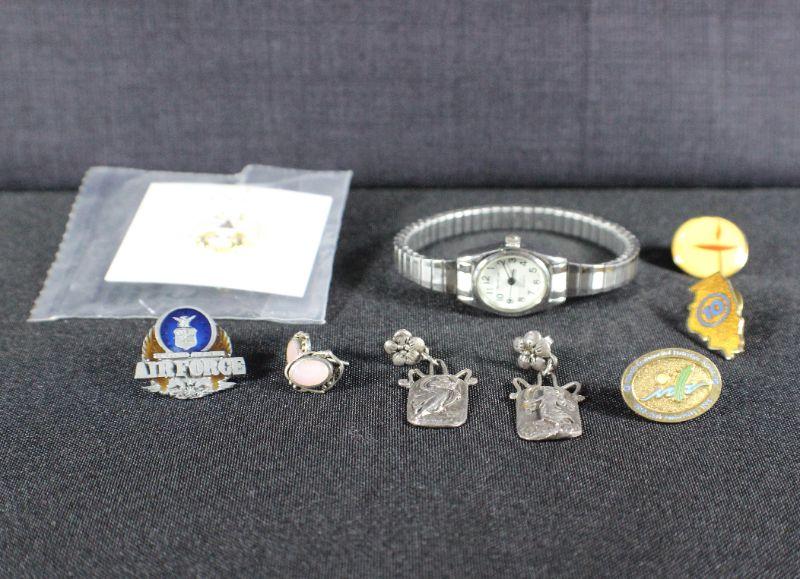 Includes: pins, ladies watch & two pairs of marked sterling earrings with a weight of 14.5g.