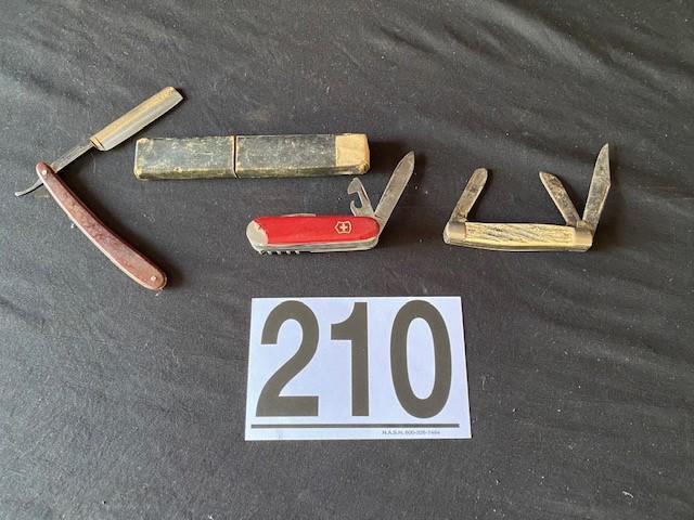 Original Swiss Army Knife, straight razor missing plastic on Swiss Army knife. Estimated weight of lot: 5lbs. Measurement: 7" x 3" x 2"